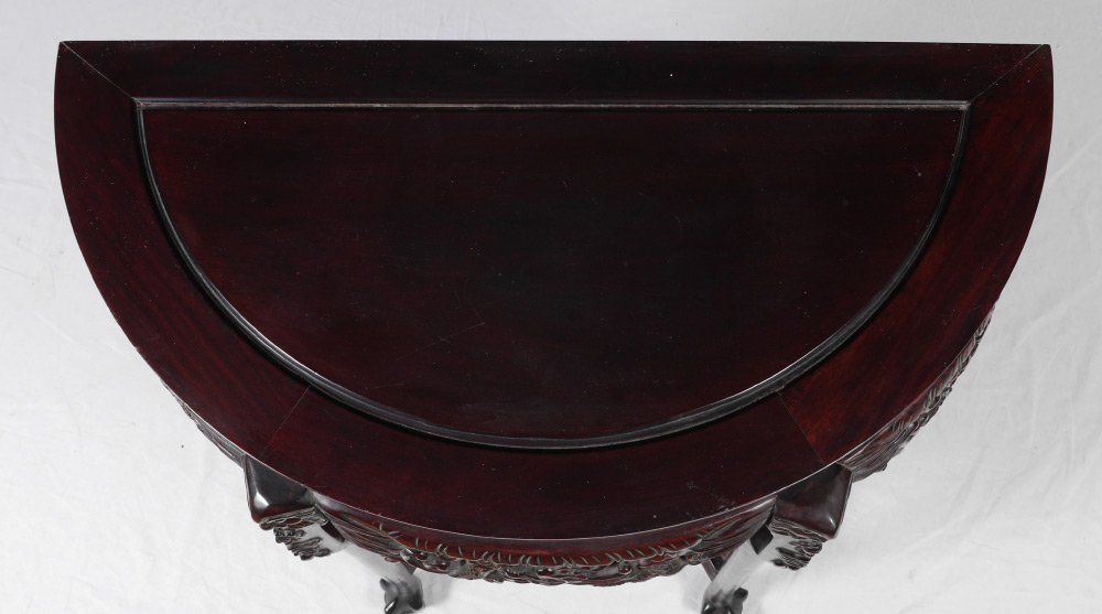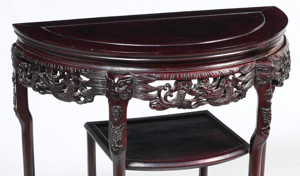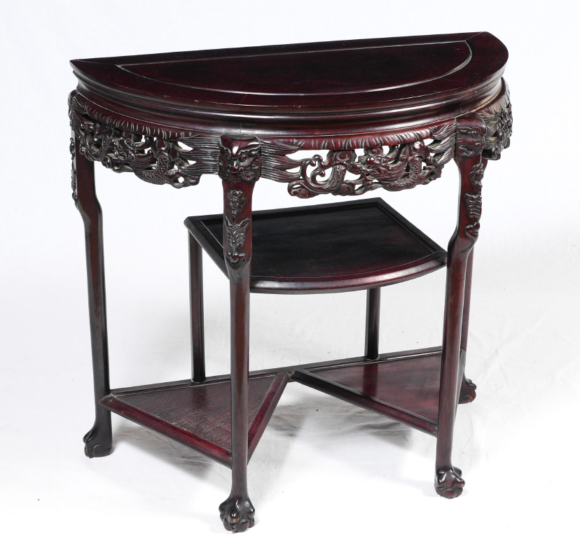 CHINESE CARVED ROSEWOOD HALL STAND: Demilune top over openwork carved skirt with figural dragons, 2 levels of 3 open shelves, claw and ball feet. Overall measures 32 1/4'' h. x 17'' x 33''.