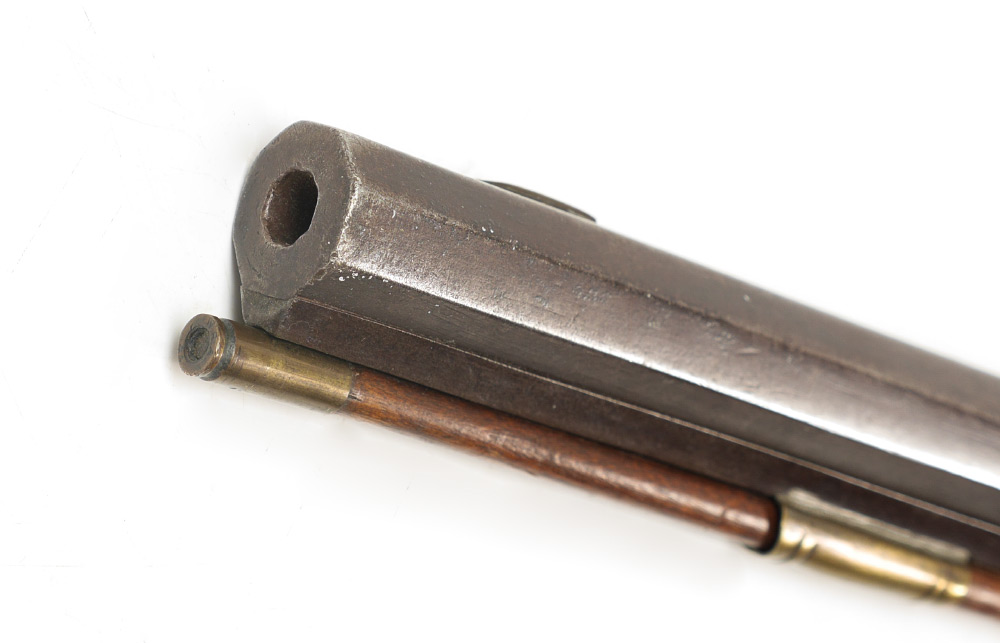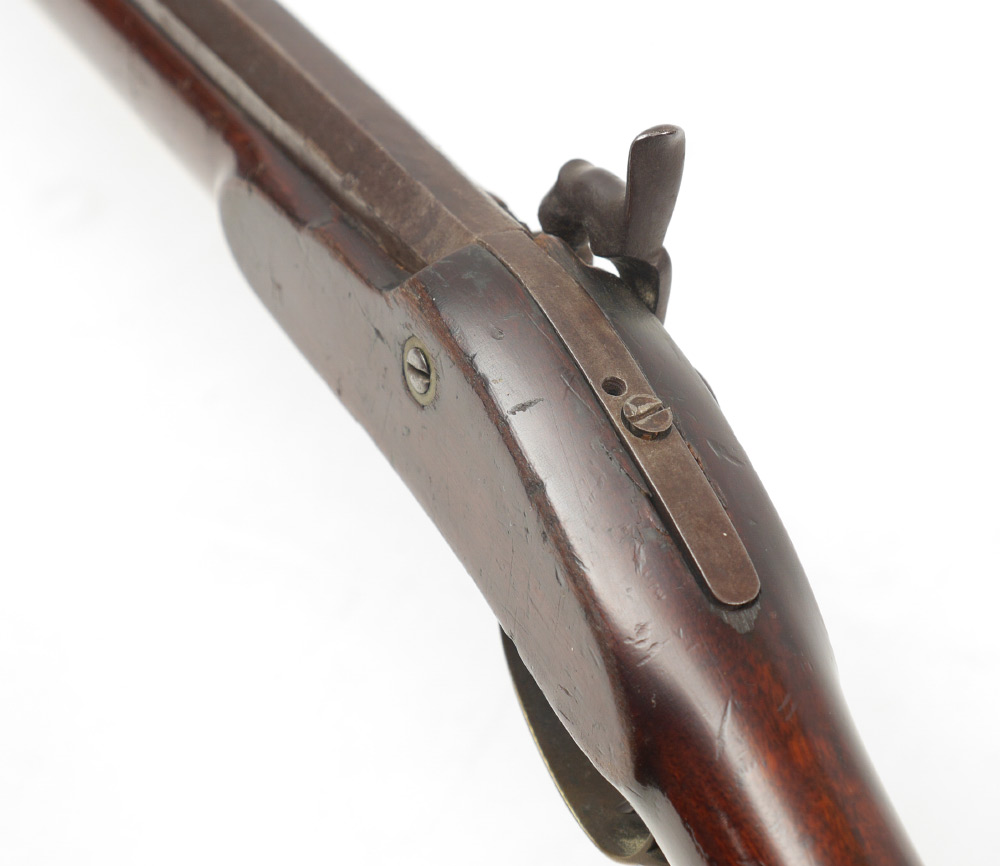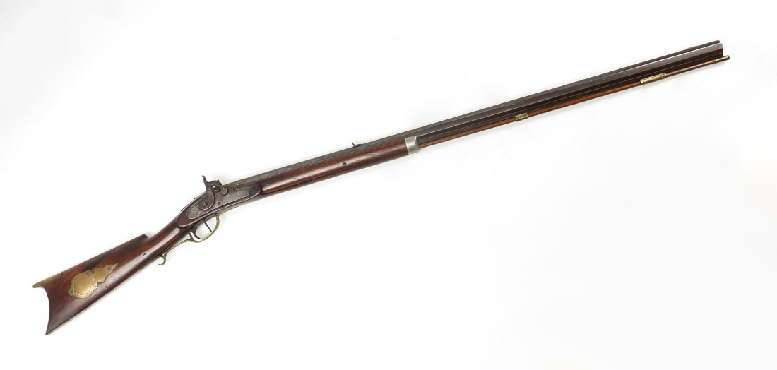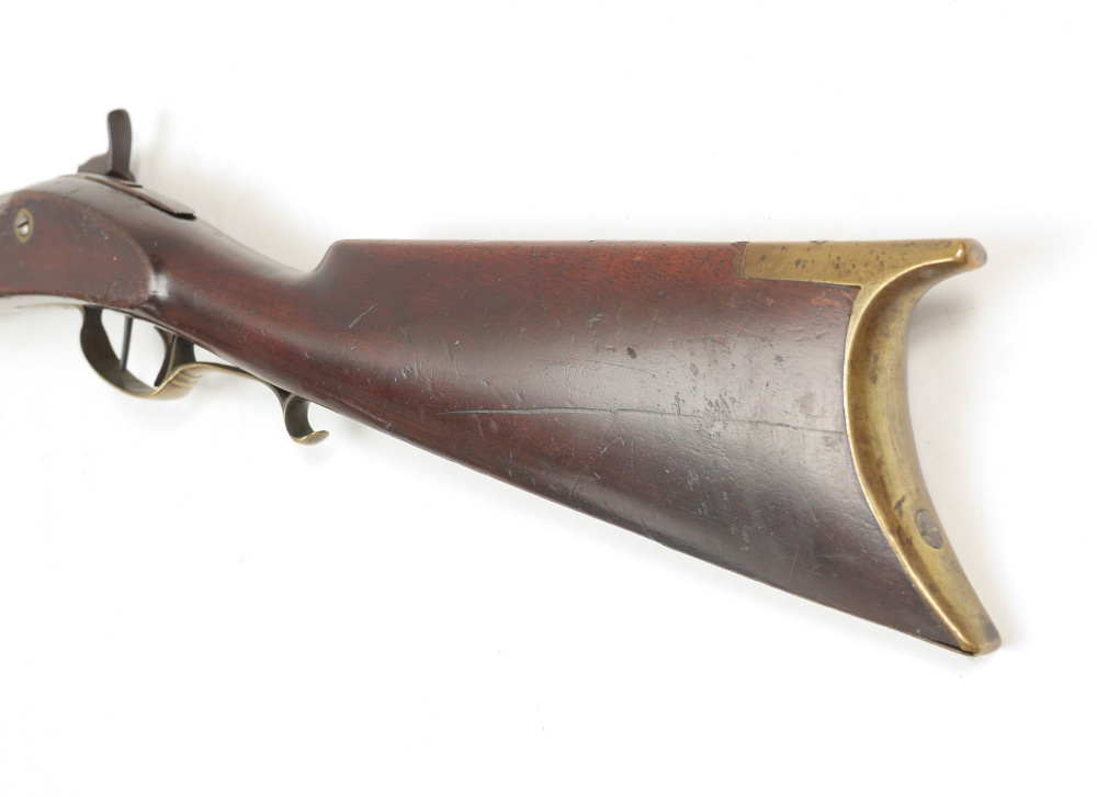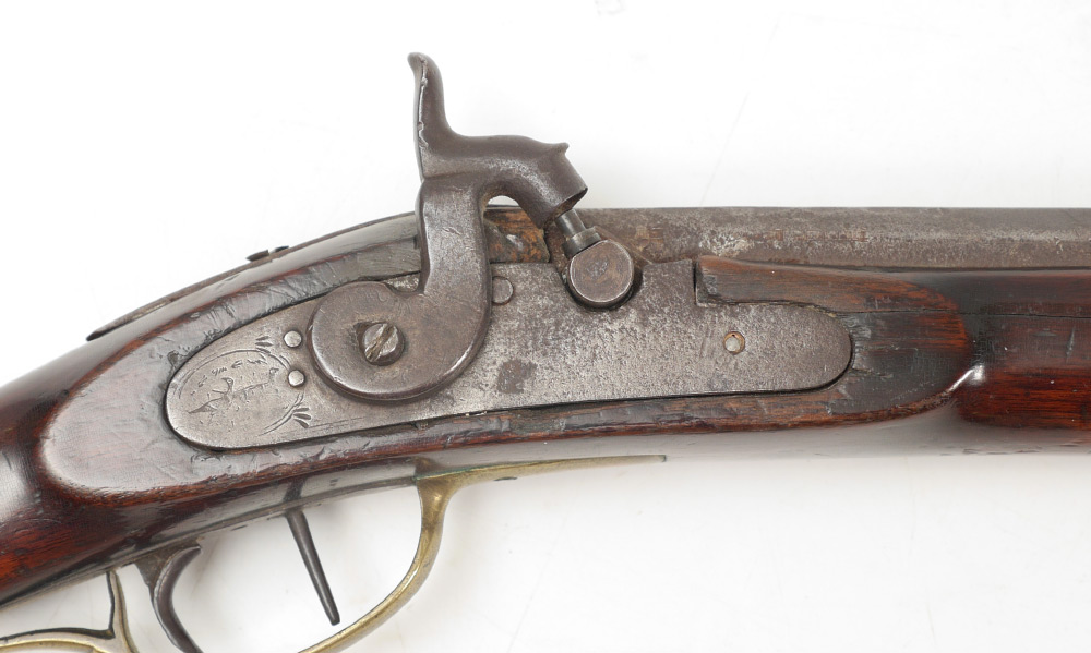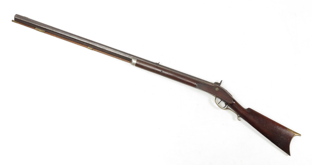 MID 19TH CENTURY PERCUSSION RIFLE: Approx. .40 caliber unmarked octagonal 35 1/2'' walnut half stock with brass patchbox and furniture. Lockplate with small engraved medallion, no visible makers mark, overall measures 51 1/2''.