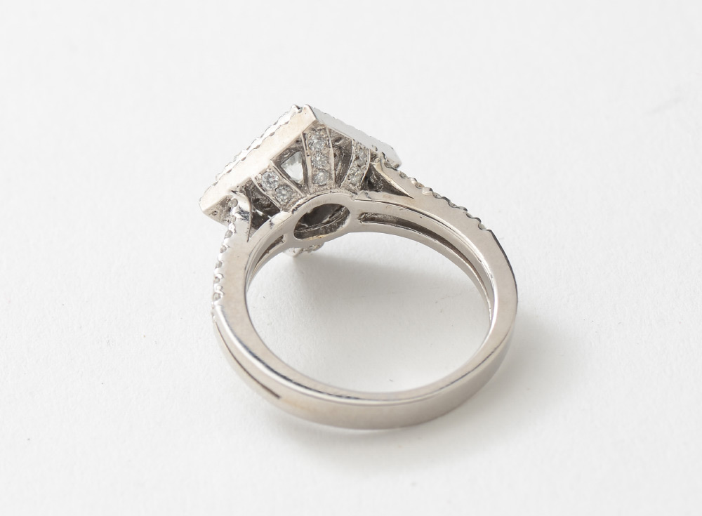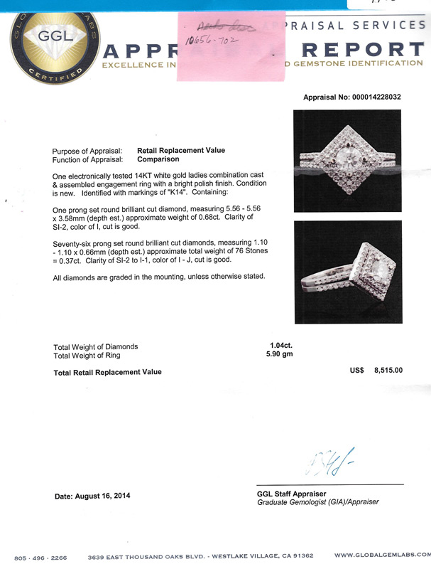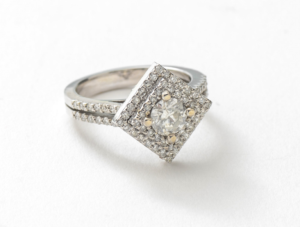 14K WHITE GOLD ENGAGEMENT RING: One prong set round brilliant cut diamond is the center piece of this ring. .68CT, clarity of I-1, color I. It is accented by 76 prong set brilliant cut diamonds with a weight of .37Ct, clarity SI-2 to I-J. Size 6.25, total weight is 5.9 grams.