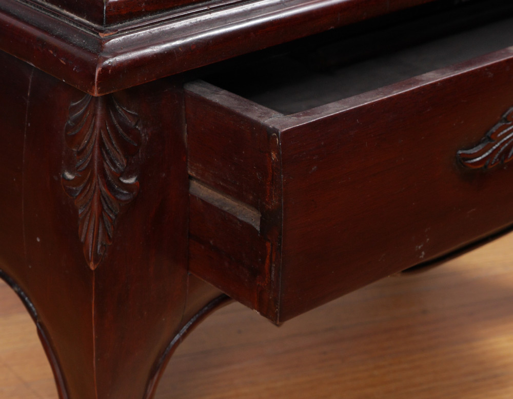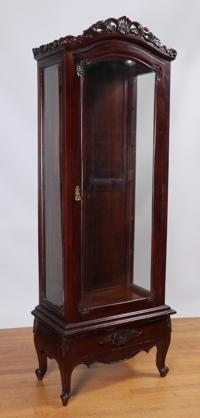 CARVED TALL VITRINE DISPLAY CABINET: Arched carved foliate motif crest, glass front door and side windows, carved skirt, shaped legs. Overall measures 79'' h. x 29'' x 16 1/4''.