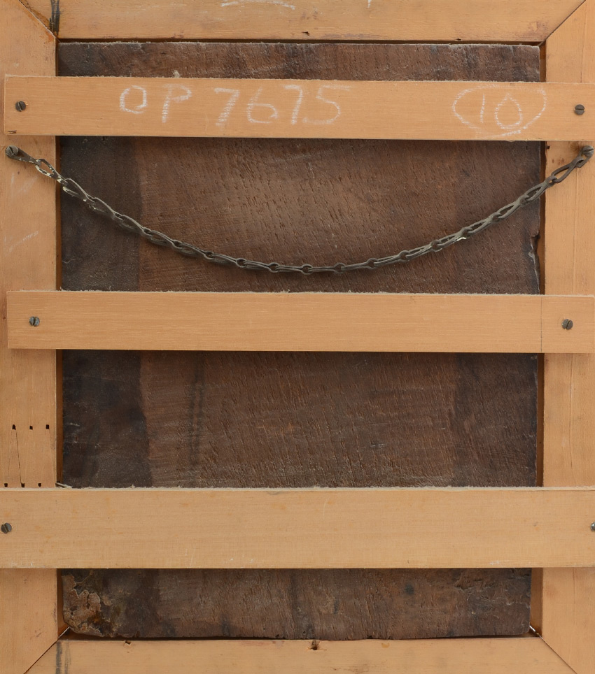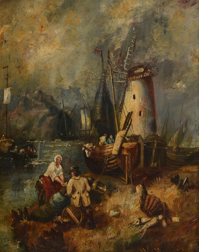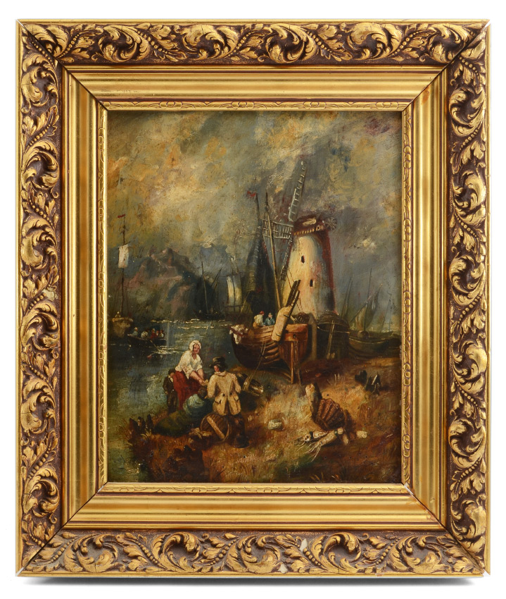 DUTCH GENRE WINDMILL PAINTING: Scene Depicts Figures Along Canal with Windmills and Boats, Oil/Chamfered Wood Panel, 14'' x 11'', no visible signature, contemporary frame, 19.25'' x 16.5''.