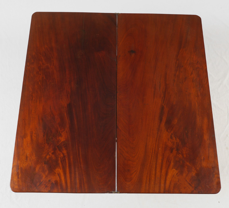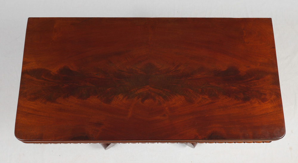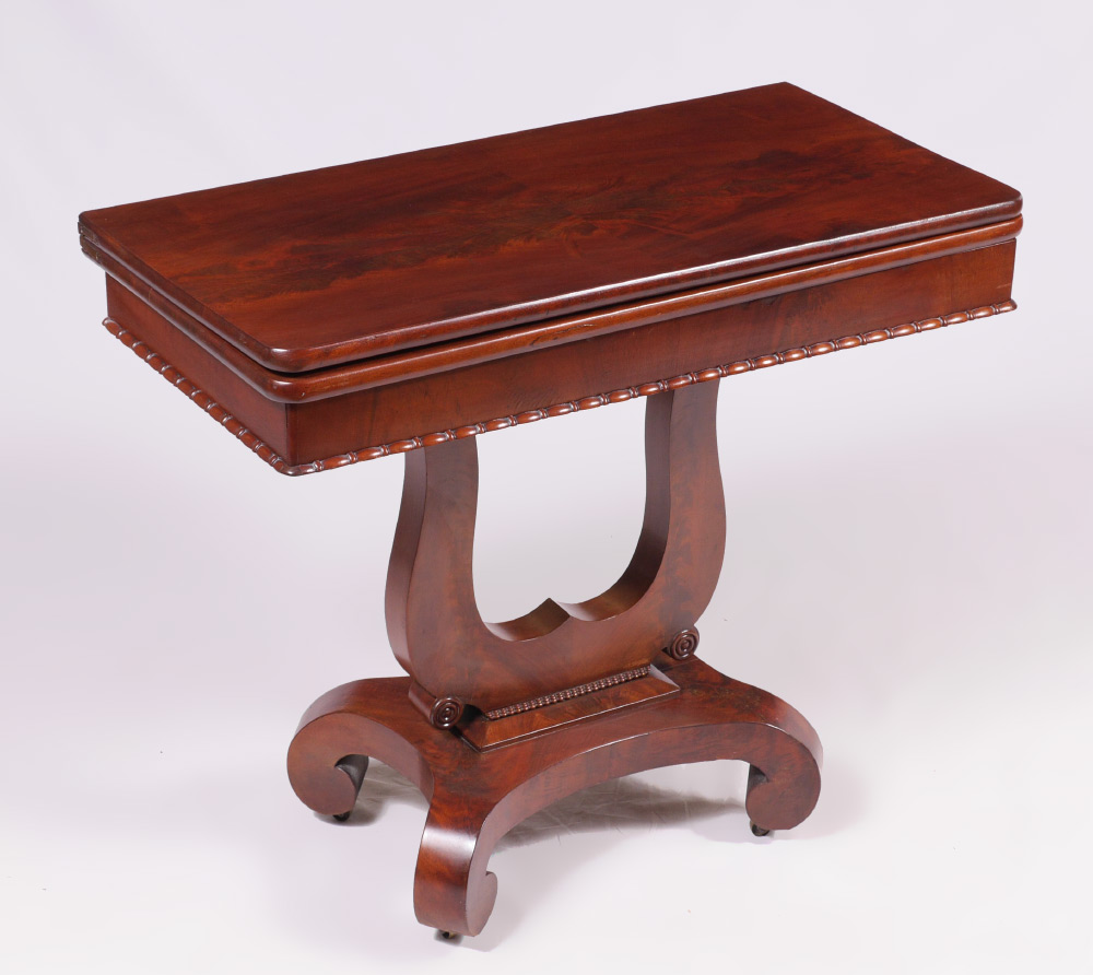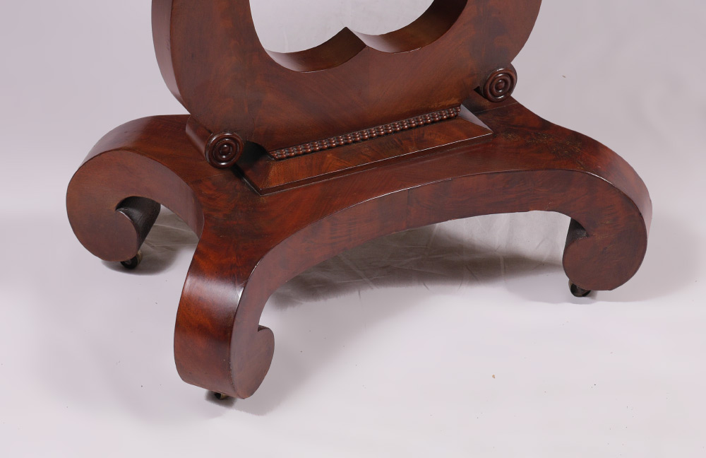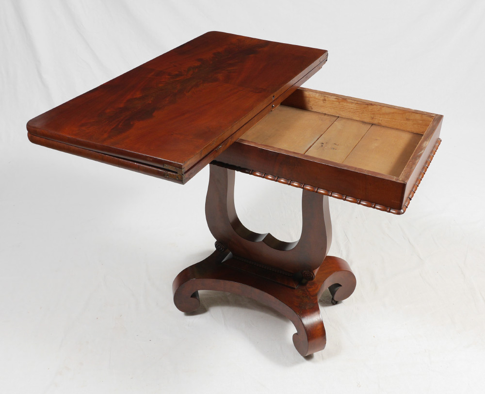 EMPIRE MAHOGANY LYRE BASE GAME TABLE: Hinged rotating top, lyre form support, 4 shaped feet. Overall measures 39 3/4'' h. x 34'' x 17''.