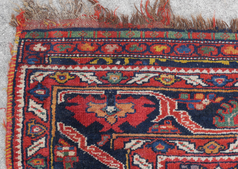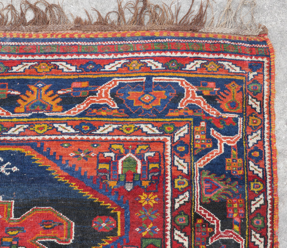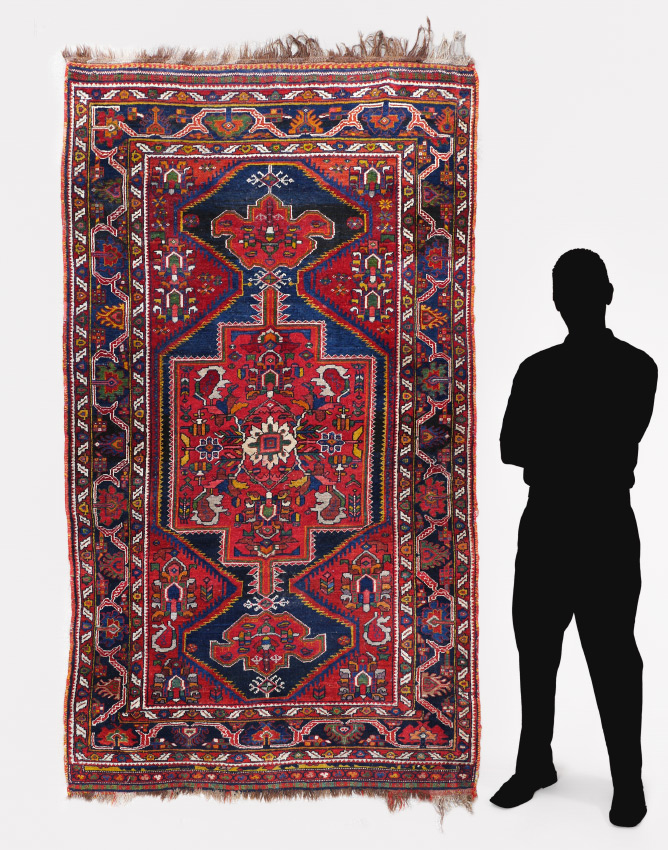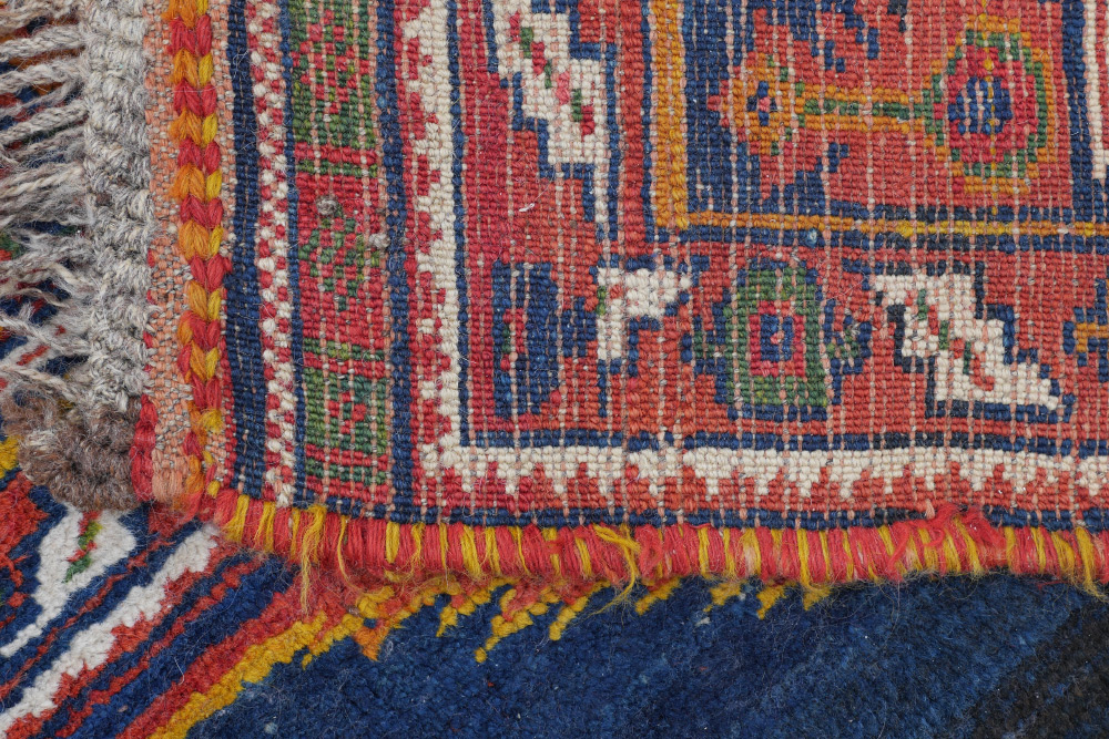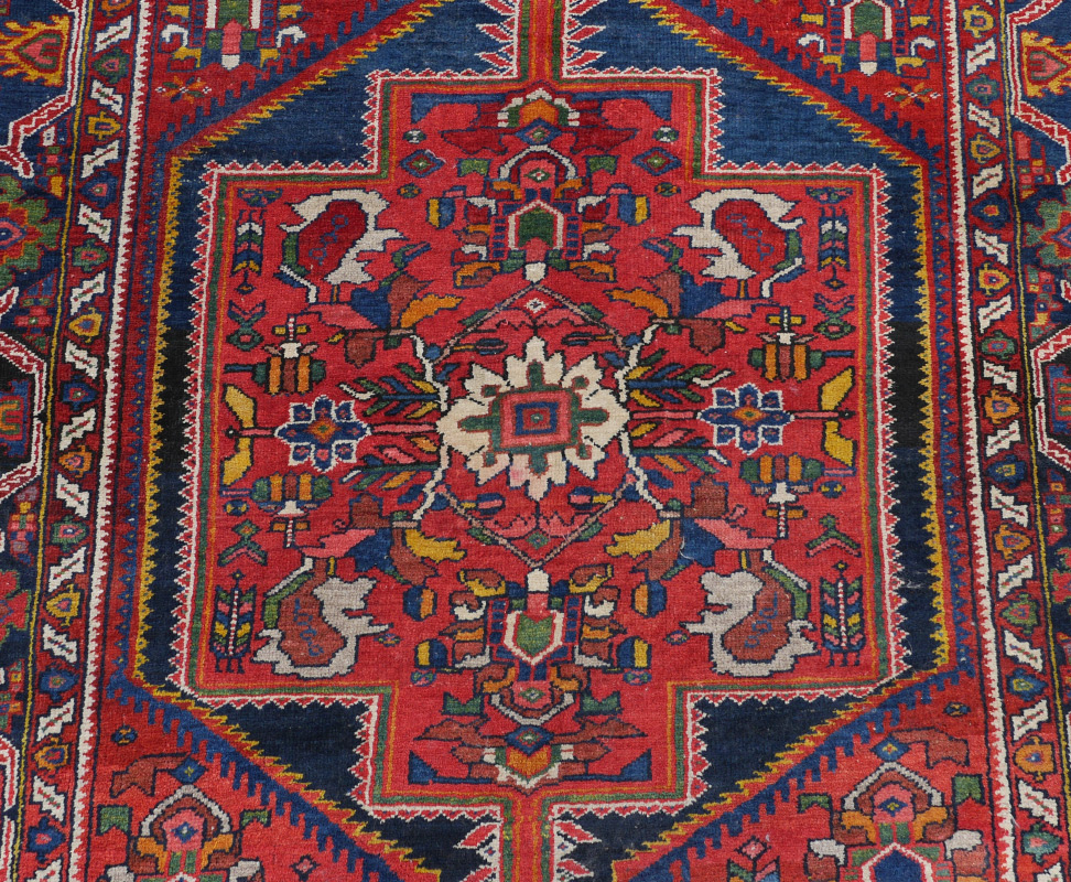 SEMI-ANTIQUE PERSIAN SHIRAZ HAND KNOTTED WOOL RUG, 5'2'' x 8': A rug with a vibrant tribal geometric design and equally vibrant colors, this Persian Shiraz rug is an appealing example for collectors of this type of rug. A red central medallion with spandrels at either end almost completely fills the blue field while the blue field looks like it has been cut out of the red outer field. The splashes of white, yellow, and green in the forms of stylized flowers and leaves further liven the rug's look. The small white serrated leaves in the guard borders and the variegated selvedge on the sides add to the tribal vine of the rug. Condition is good.
