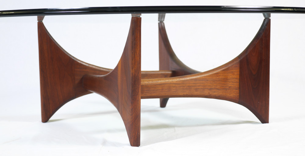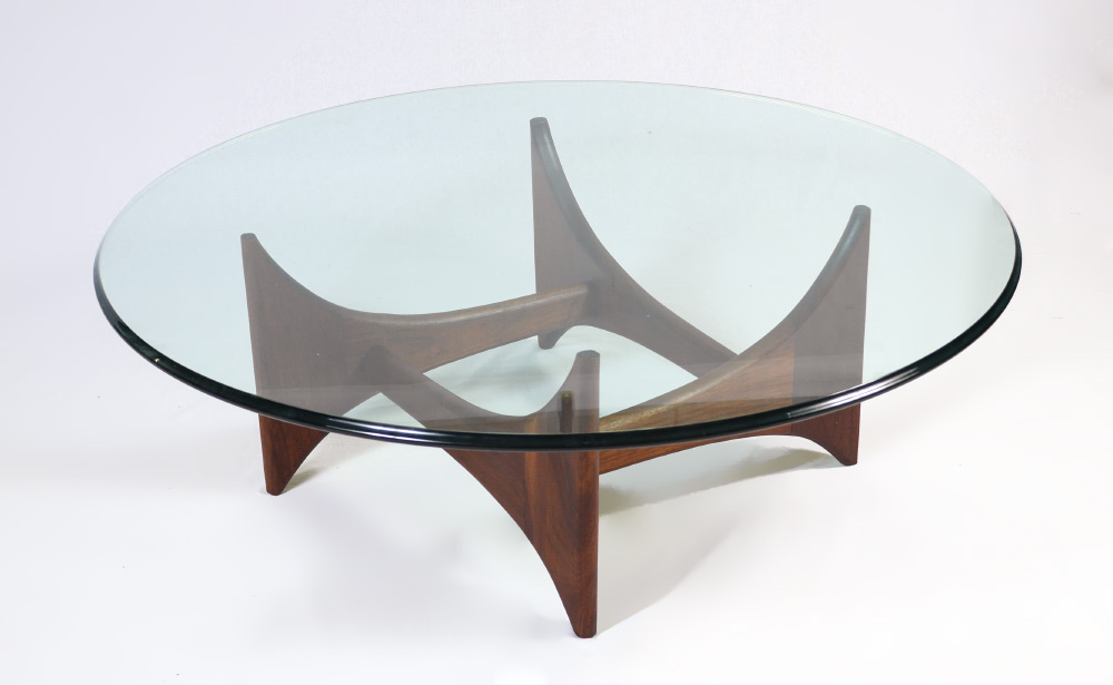 ADRIAN PEARSALL CRAFT ASSOCIATES WALNUT GLASS TOP TABLE: Walnut base with 4 shaped supports and stretcher, unmarked, base measures 14 3/4'' h. x 28'', beveled glass top 48'' dia.