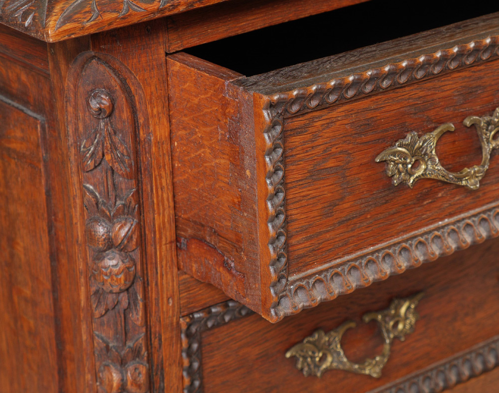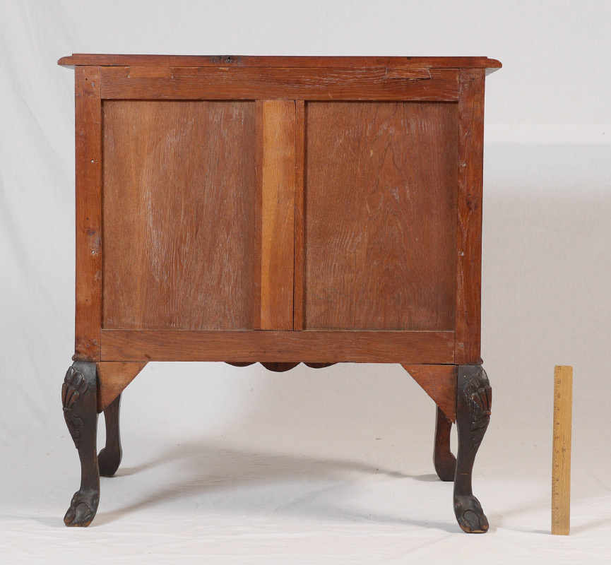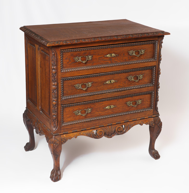 CARVED OAK CHEST OF DRAWERS: Rectangular top with carved trim over 3 drawers with brass pulls, canted corners with floral decoration, carved skirt, ball & claw feet. 34'' h. x 31 1/4'' h. x 19 1/2''.