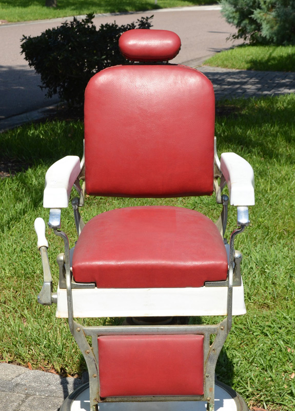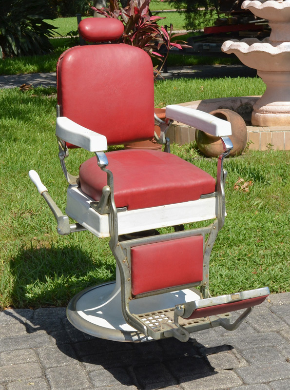 KOKEN BARBER CHAIR: White enamel and chrome cast iron frame with red vinyl upholstery. 46'' 1/2'' h. x 26'' x 41''.