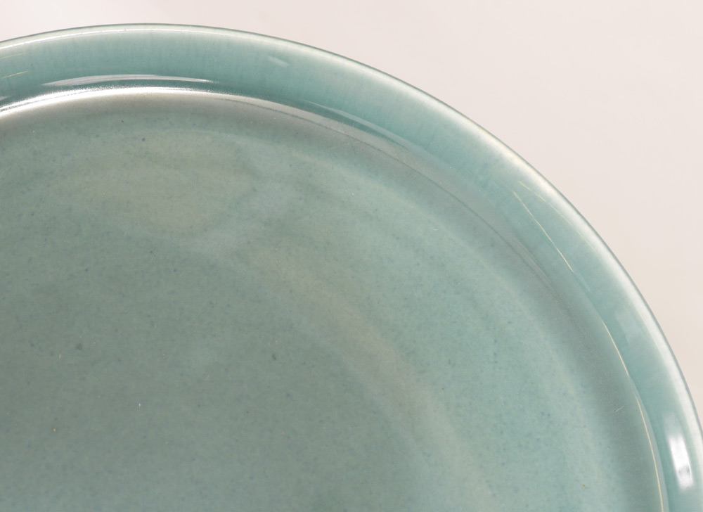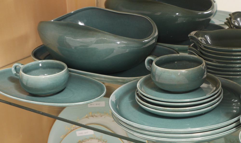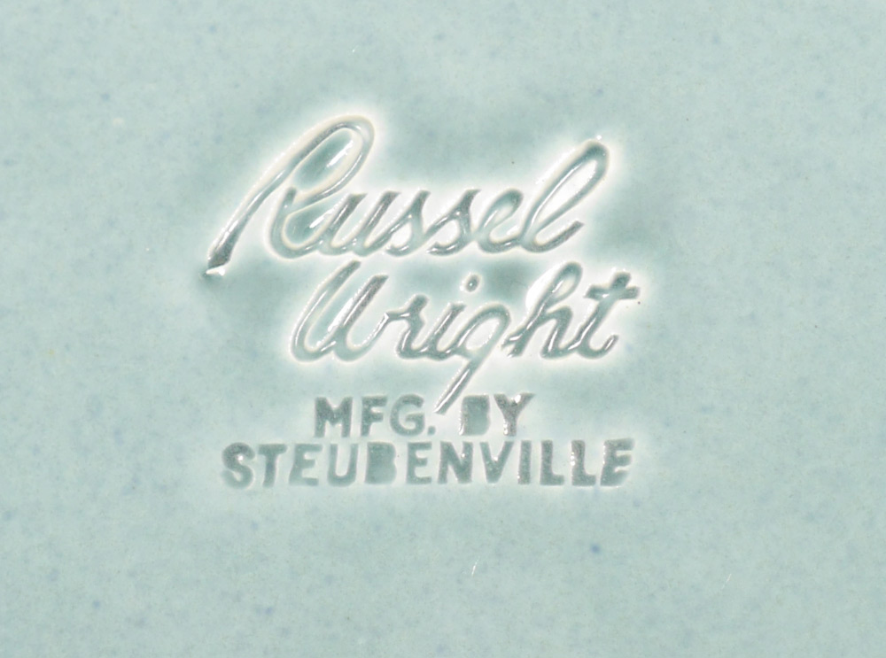 RUSSELL WRIGHT STEUBENVILLE SEAFOAM GREEN DINNERWARE: Approx. 48 pieces in the American Modern pattern, designed by Russell Wright for Steubenville to include 7 dinner plates (10''), 5 bread plates (6''), 8 lugged soup bowls (7''), 8 lugged dessert bowls (6 1/4''), 6 teacups and 8 saucers, platter (13 1/4'' x 9''), relish tray, open vegetable (11 1/4'' x 6 1/4''), 2 serving bowls (9 1/2''), covered casserole (12'').