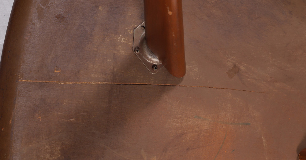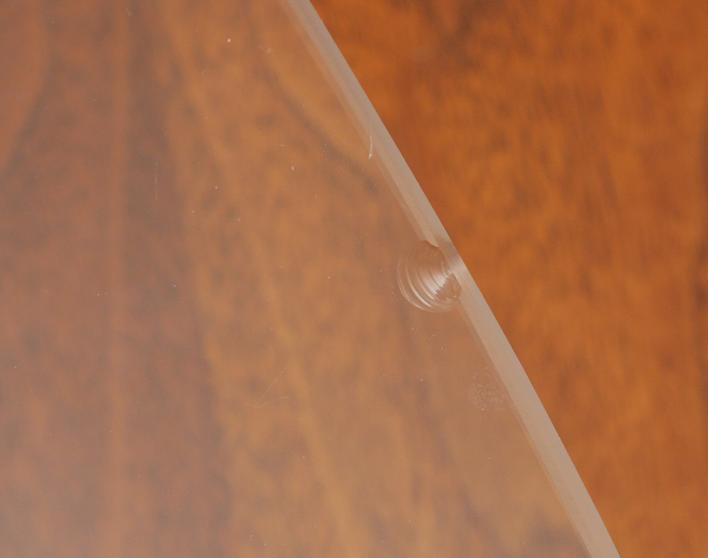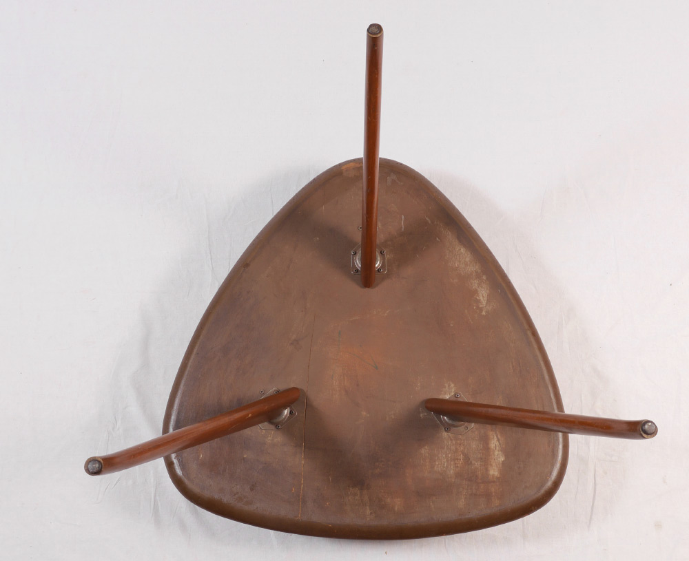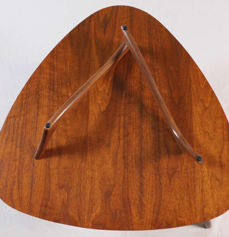 MID CENTURY TIERED GLASS TOP SIDE TABLE: Unmarked, in the style of Vladimir Kagan or Adrian Pearsall, raised triangular glass top over shaped support, affixed to triangular walnut top on shaped legs. Overall measures 22 3/4'' h. x 29 1/2'' x 30 3/4''.