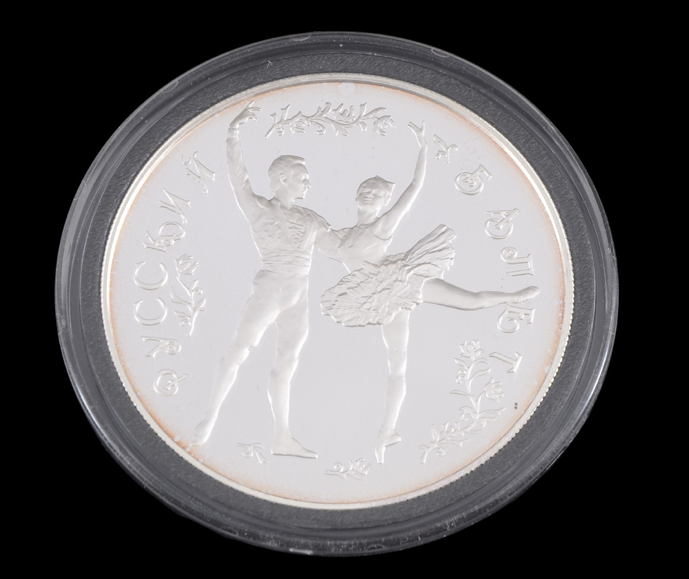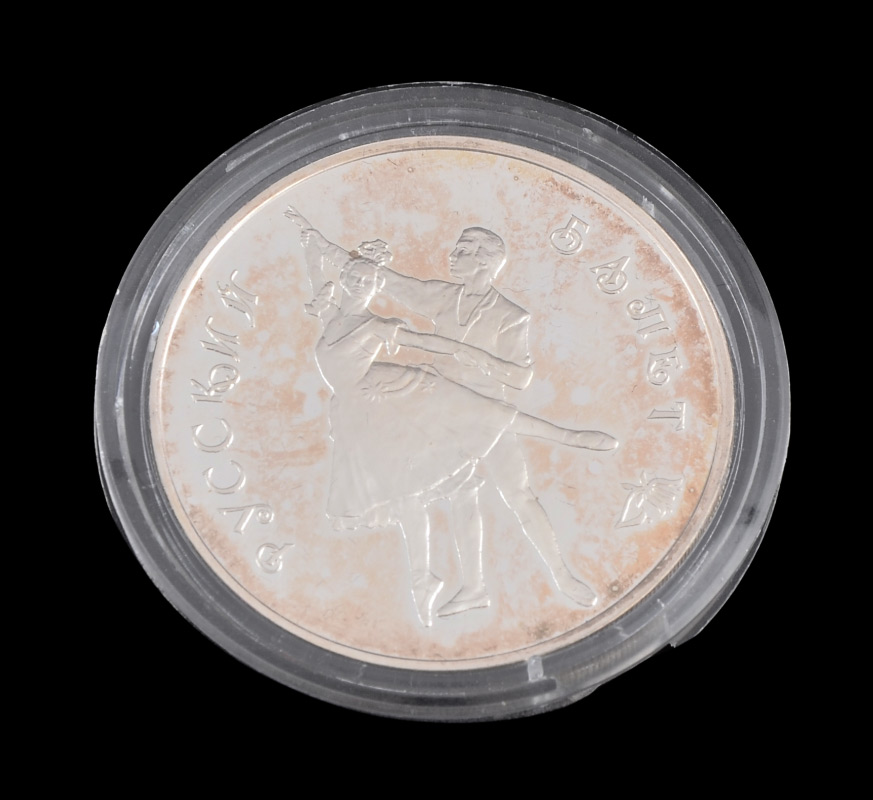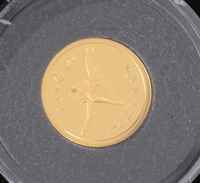 '93 RUSSIAN 1ST BALLERINA SILVER & 24K GOLD COINS: 1993 Proof Set Includes 4 Different Coins: 1) 3 Ruble, .99 silver, 31.3g; 2) 10 Ruble, .999 gold, 1.555g; 3) 25 ruble, .900 silver, 155.5g; 4) 25 Ruble, .999 gold, 3.11g. Comes with a beautifully colored card depicting the ballerina and her partner; card is 1 gram of gold. Sold in the velvet lined 1993 proof set box.