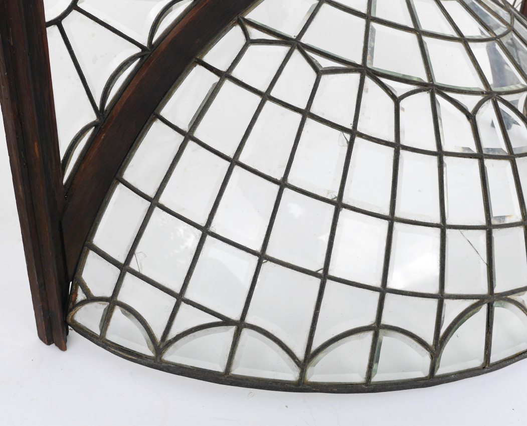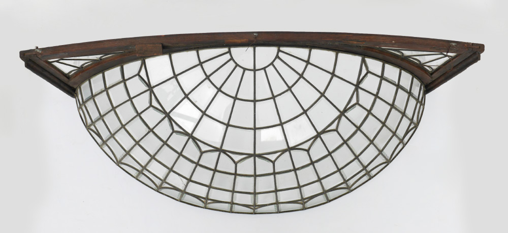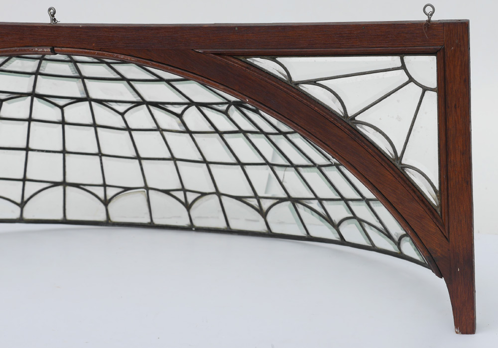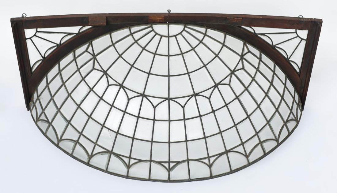 LEADED BEVELED GLASS CANOPY AWNING: Beveled clear glass panels, half hemisphere front with 2 side lights in upper corner, frame with slight concave curve from center. Overall measures 18'' h. x 48'' x 20 1/2''.