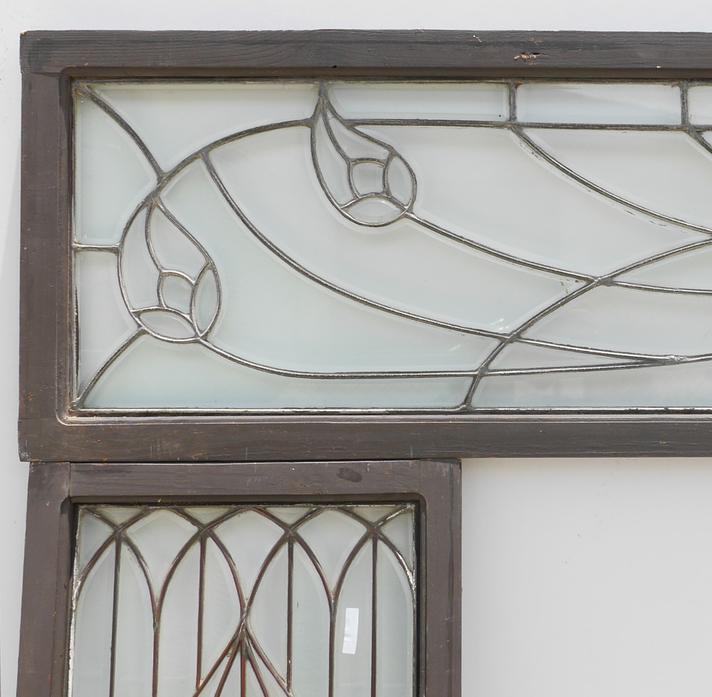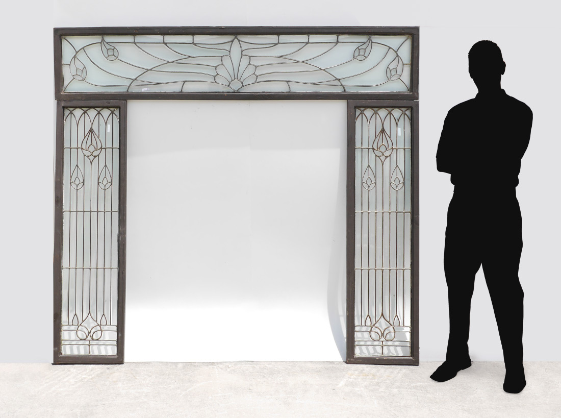 3 PIECE LEADED GLASS DOOR SURROUND: Art nouveau motif, stylized flowers with clear beveled panels. Transom measures approx. 17 1/4'' x 86 3/4'' x 1 1/2'', side panels or door inserts 61 1/2'' x 17'' x 1 1/2''.