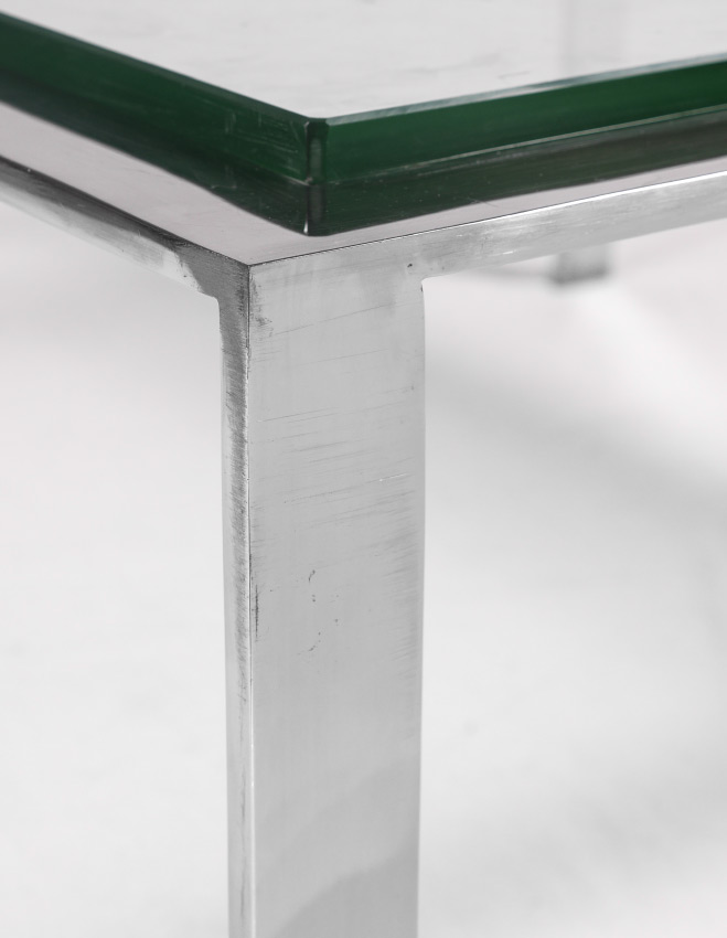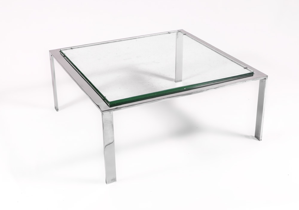 STAINLESS STEEL FLOATING GLASS SIDE TABLE: Modern floating glass top over stainless steel frame, legs alternate in direction. Overall measures 16 1/2'' h. x 36'' x 36''.