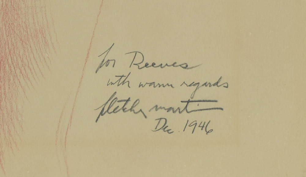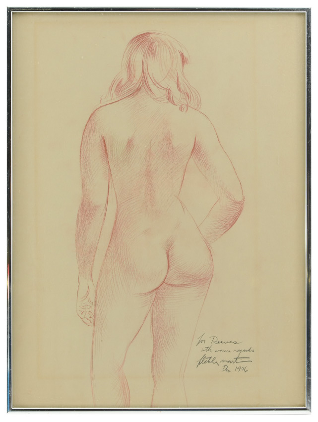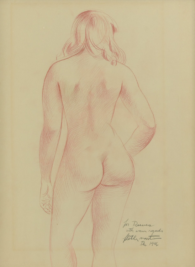 MARTIN, Fletcher, (American, 1904-1979): Nude Drawing, 1946, inscribed to a ''Reeves'', sight size 19.5'' x 14.5'', modern chrome frame 20.25'' x 15.25''. Growing up in a small western town in California, Martin drew inspiration from circus posters and local amateur painters. Under the tutelage of Mexican painter David Alfaro Siqueiros, he went on to begin painting murals at local federal buildings, which commonly portrayed the strife and dangers of the local mining industries.