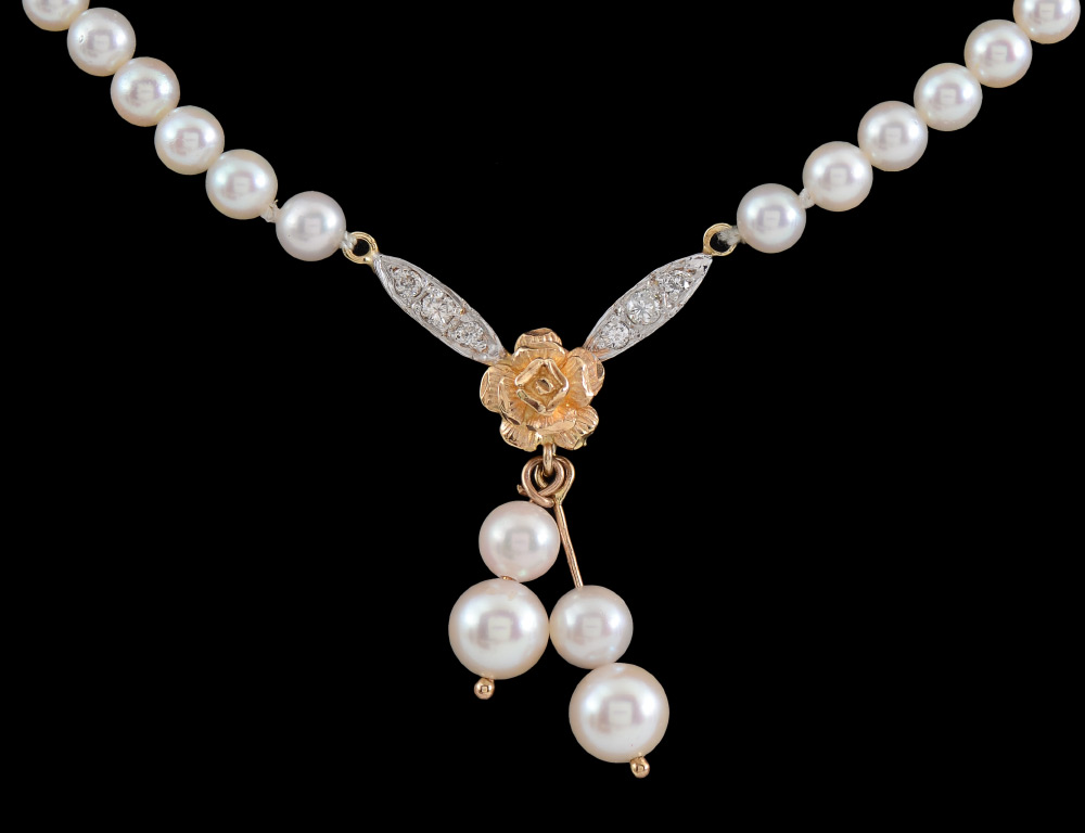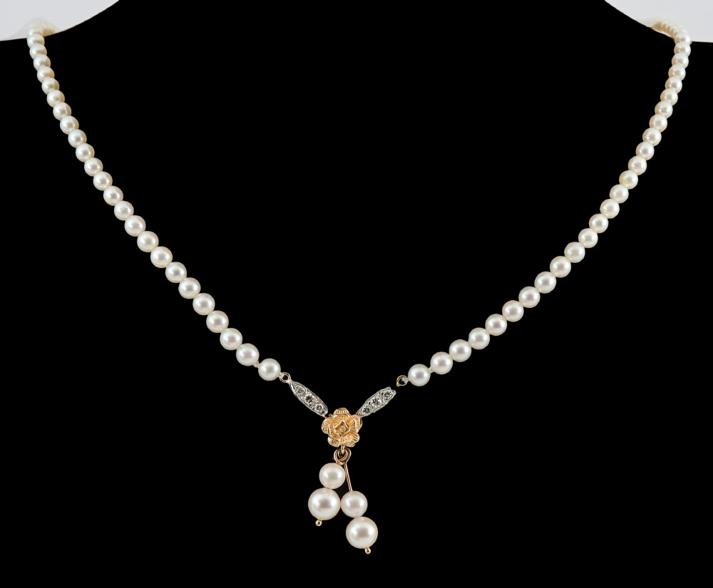 17'' AKOYA PEARL NECKLACE WITH DIAMONDS: Necklace is strung with 110 round drilled Akoya Cultured Pearls that graduate from 3 mm to 7 mm. The central accent has six (6) round full cut diamonds at 0.20 carat total weight, color J-K, and clarity I-2 to I-1. Closure with magnetic clasp.
