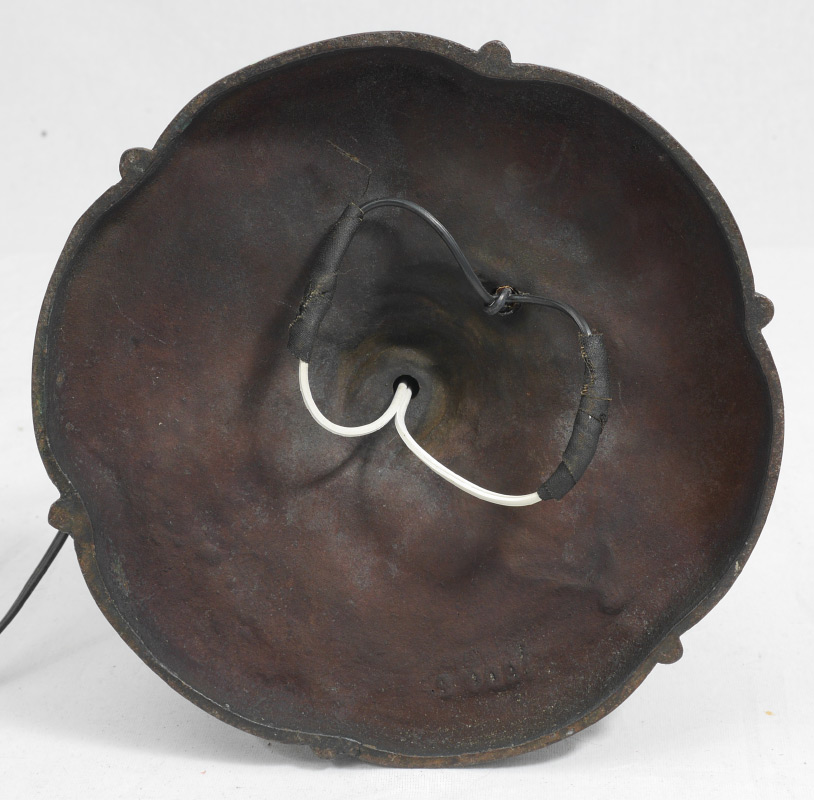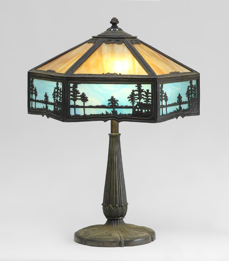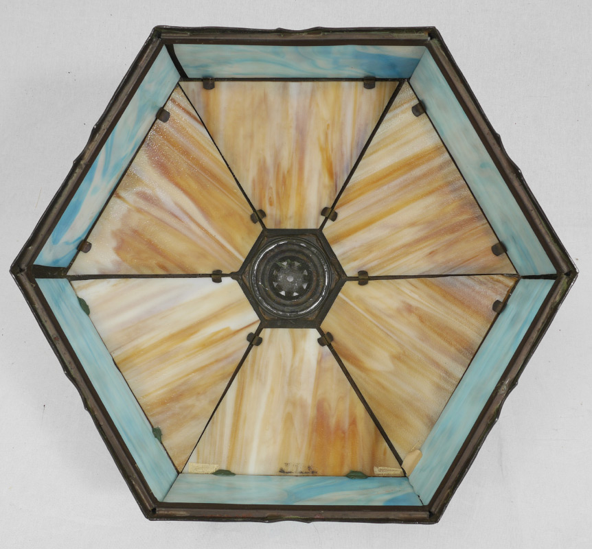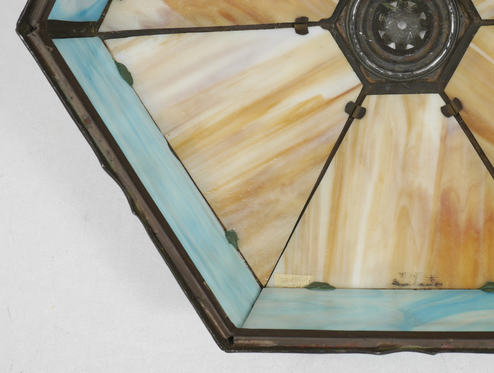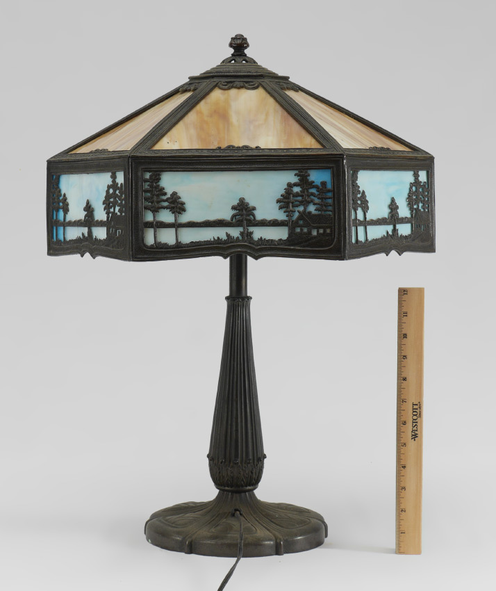 CARAMEL SLAG GLASS TABLE LAMP: Art nouveau cast metal base with double socket fixture, 6 panel caramel slag glass shade over 6 blue slag glass panels with lake shore filigree scene in each panel. Base overall 24'' h. x 9 1/4'', shade 9 3/4'' x 16 1/2''.