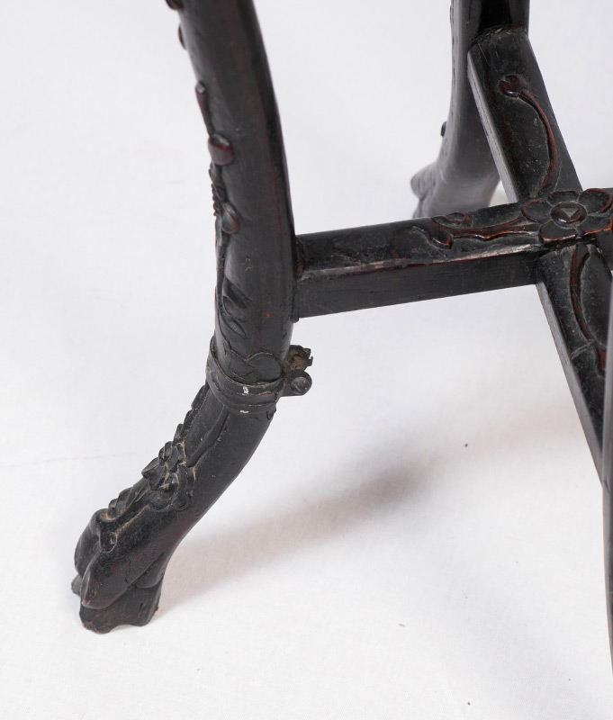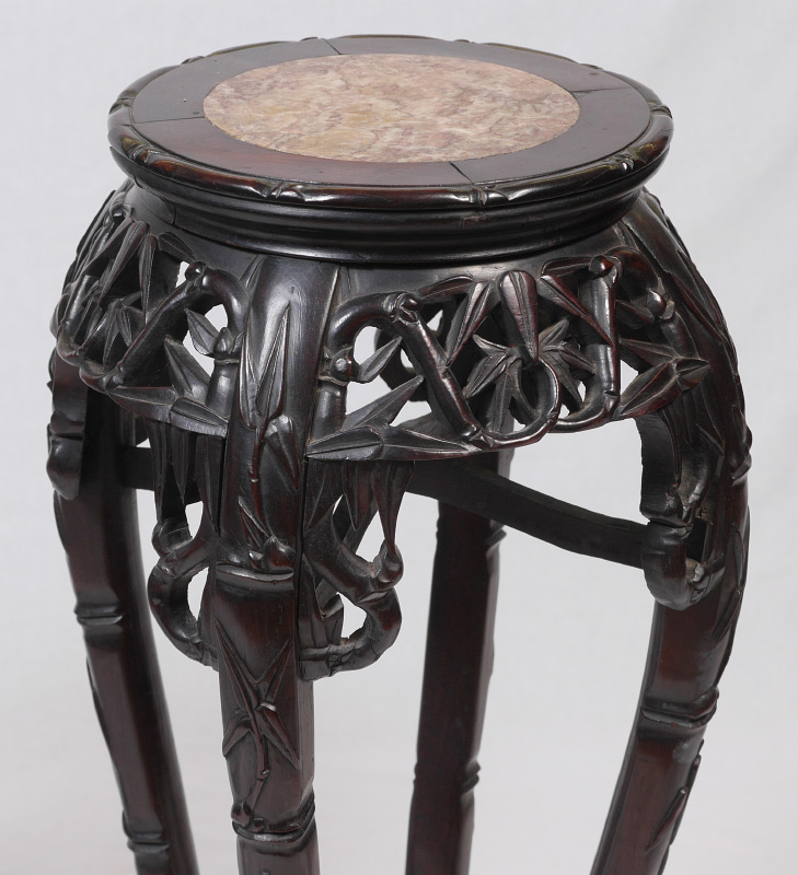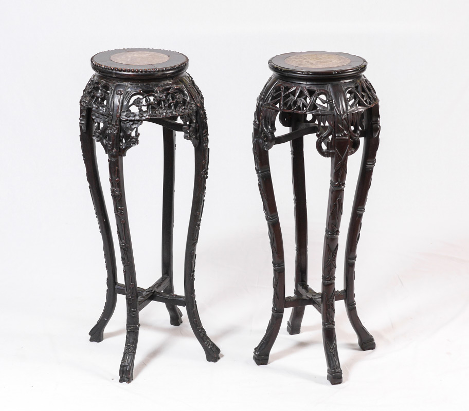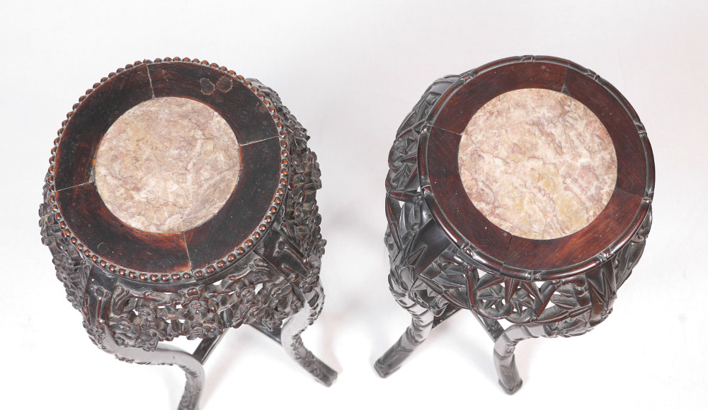 2 ORIENTAL CARVED MARBLE TOP FERN STANDS: Both with round inset marble tops to include 1) Bamboo motif frame, openwork skirt, 36'' h. x 11'' top, 13 1/4'' dia overall. 2) Carved floral motif with openwork skirt, 36 1/4'' h. x 11'' top, 14'' dia. overall.