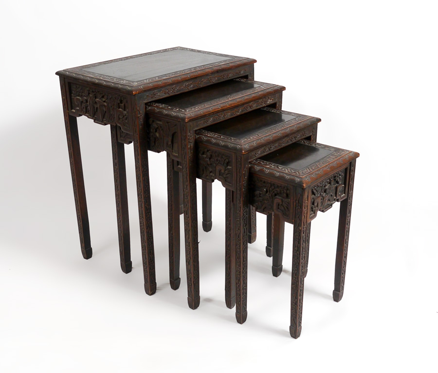3 STACK CHINESE NEST OF TABLES: Rectangular top with carved trim, relief carved skirts with oriental genre motifs, carved legs. Tallest measures 36 1/2'' h. x 21'' x 14 1/4''.
