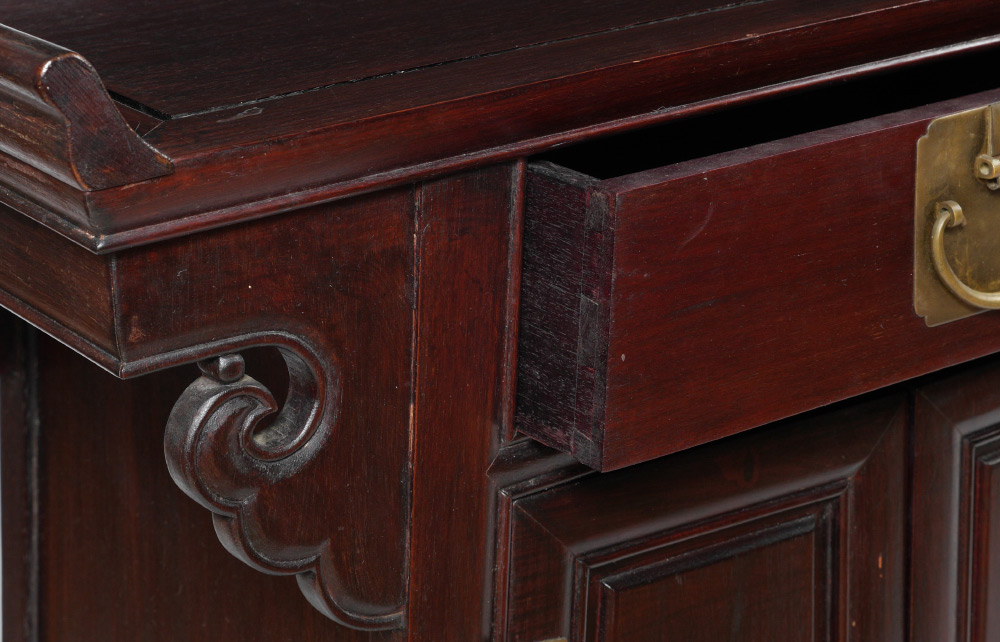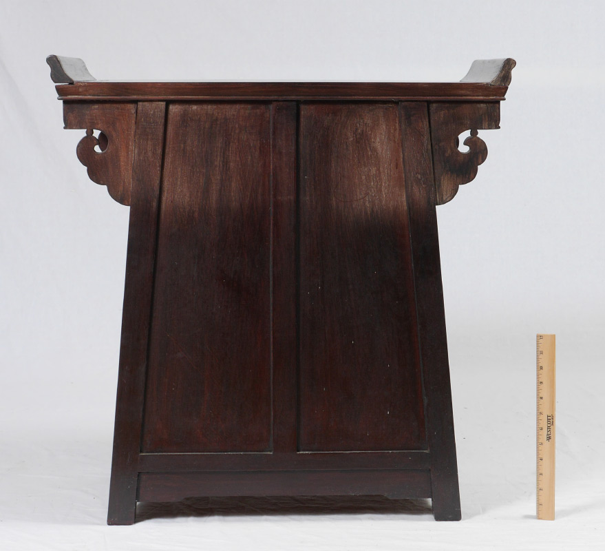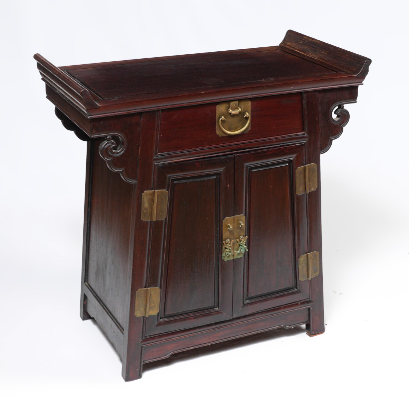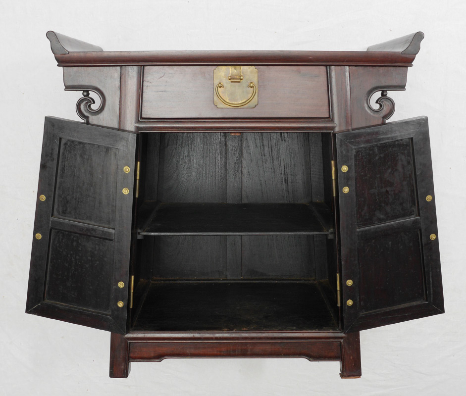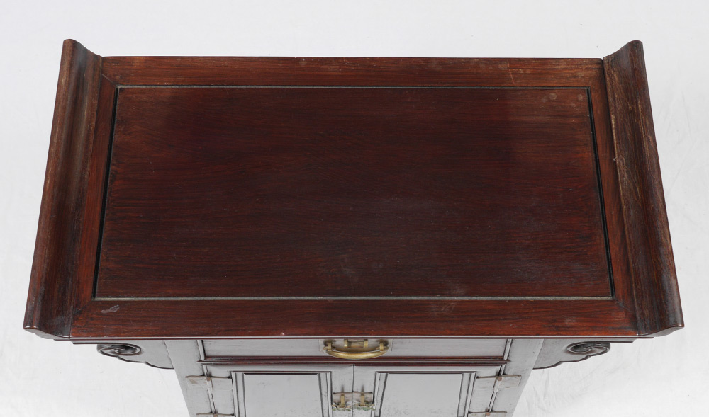 ORIENTAL ROSEWOOD ALTAR CABINET: Rectangular top, shaped corbels, tapered body with single drawer over 2 doors, overall measures 30 1/2'' h. x 29'' x 15''.