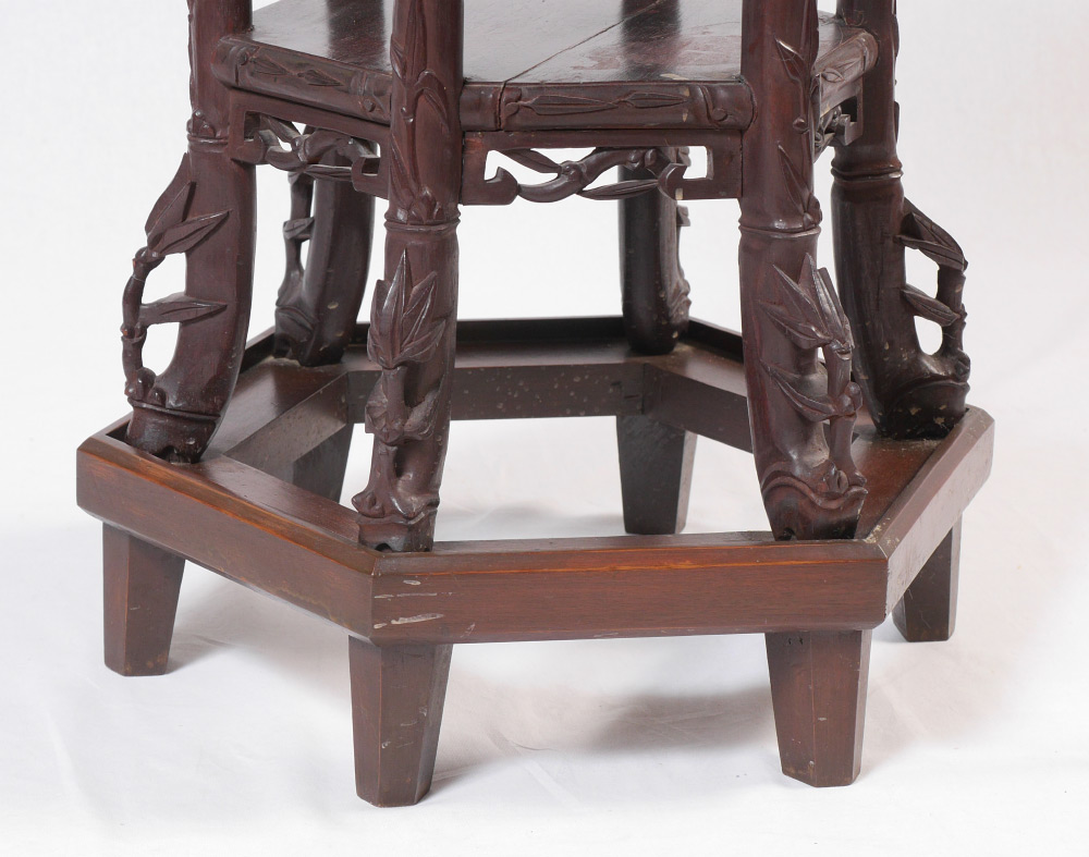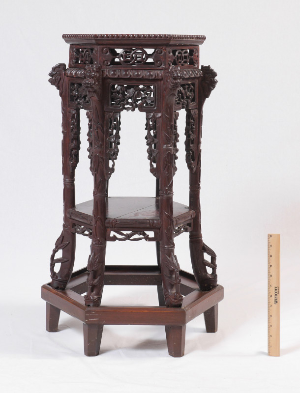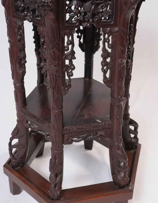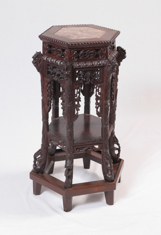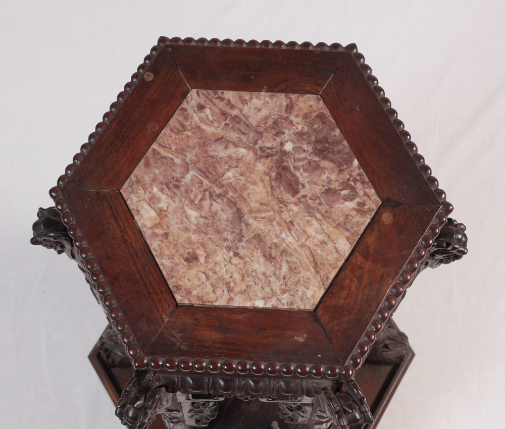 ORIENTAL CARVED MARBLE TOP JARDINIERE STAND: Hexagonal marble inset top, openwork skirt, carved supports with foo lion masquerons to top joint, lower open shelf. Overall measures 31 1/2'' h. x 13'' top, 17'' base.