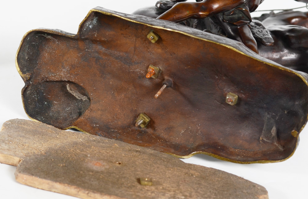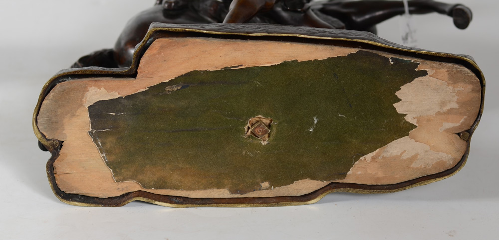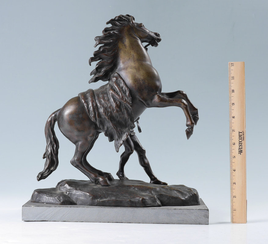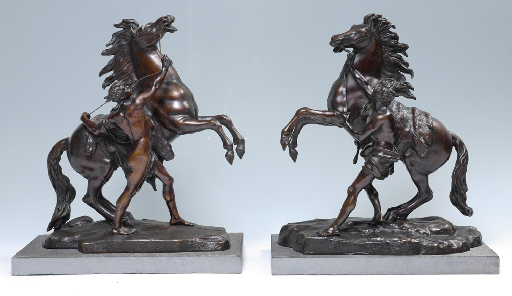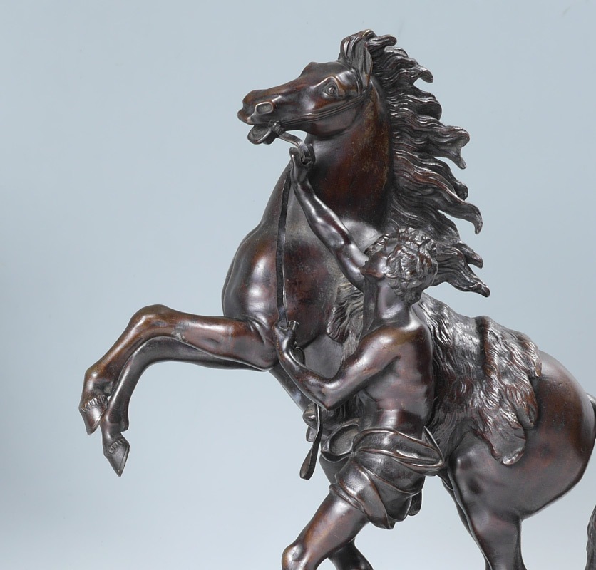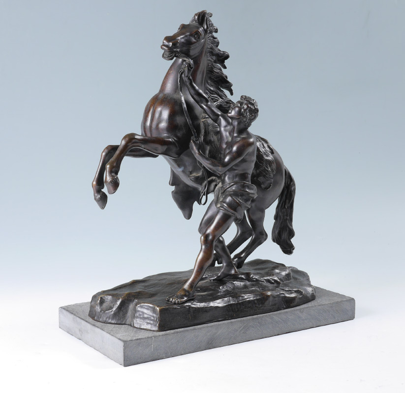 PAIR AFTER COUSTOU BRONZE MARLY HORSE SCULPTURES: After Guillame Coustou, patinated bronze figures of man calming a rearing horse, unsigned, 15'' h. x 13 1/4'' x 6 1/2''. Sold with marble plinths.