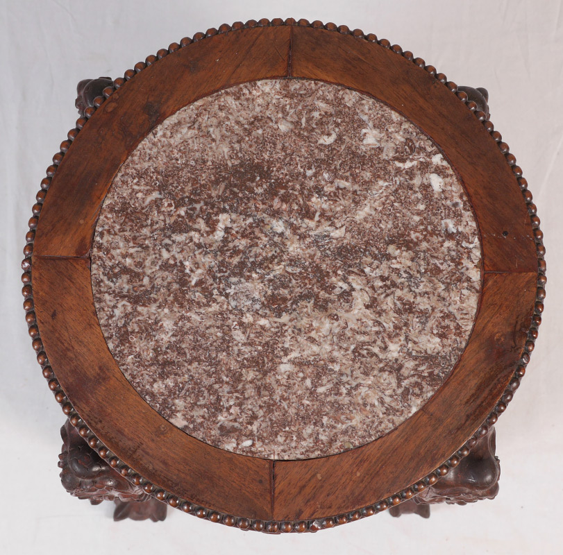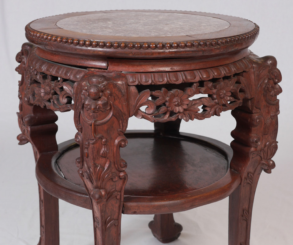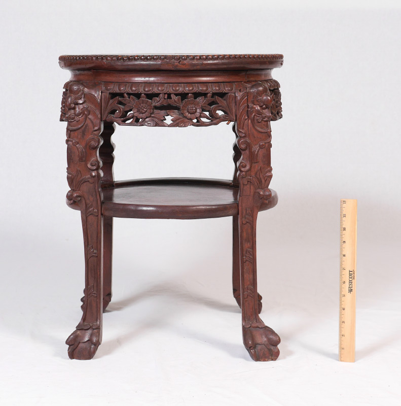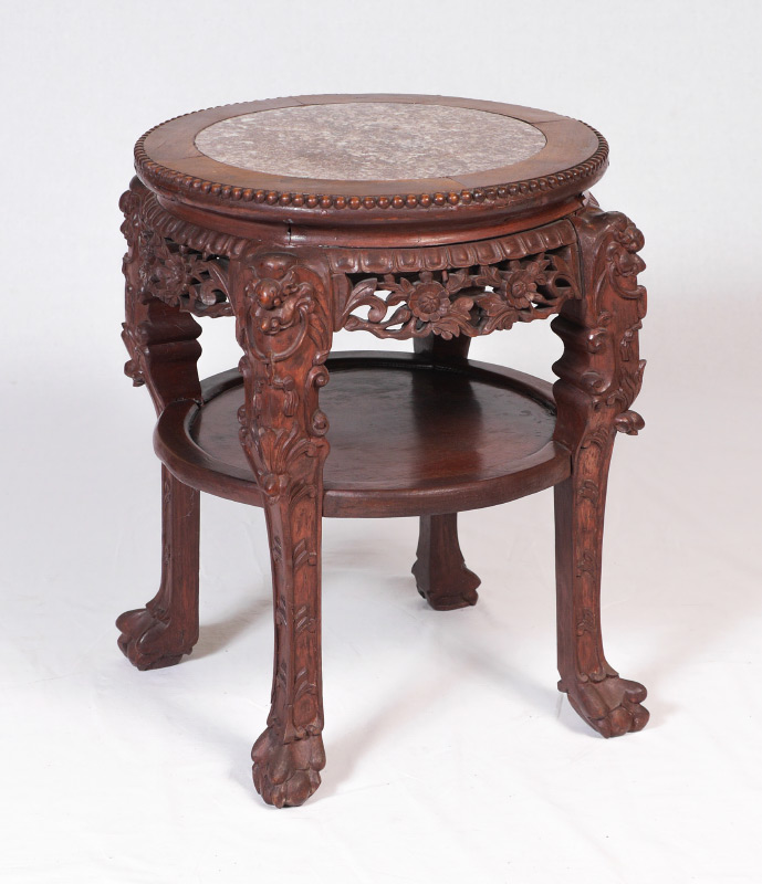 ORIENTAL CARVED MARBLE TOP JARDINIERE STAND: Round inset marble top, openwork floral skirt, open lower shelf, carved legs ending in paw feet. 23'' h. x 18'' dia.