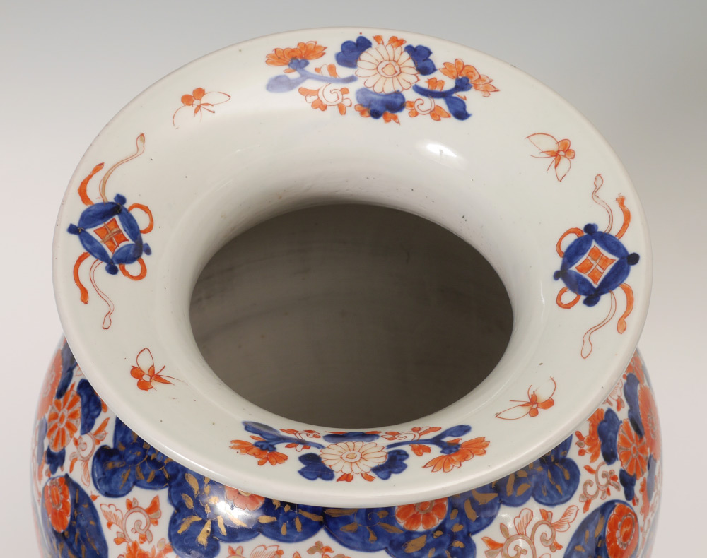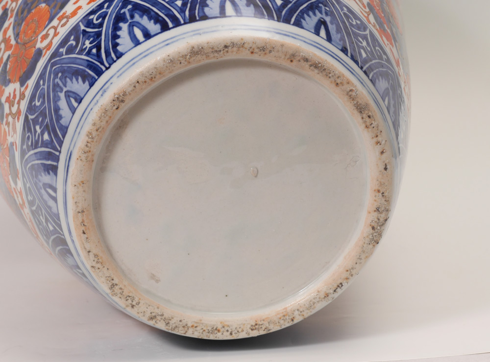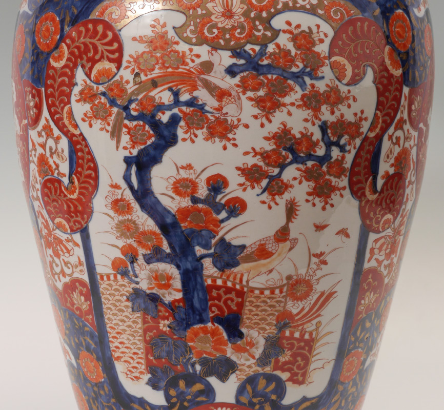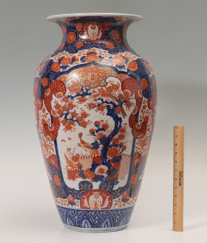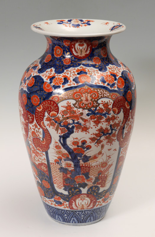 JAPANESE IMARI FLOOR VASE: Baluster form vase with typical Imari floral decoration and genre scene in reserves. Unsigned, 25'' h. x 14 1/2'' dia.