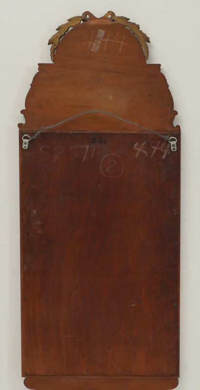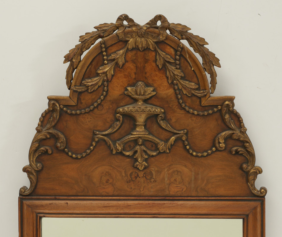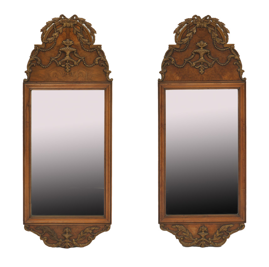 PAIR OF CARVED WALL MIRRORS: Matched pair, crest with carved urn and foliate decoration over burl wood veneer, rectangular mirror, carved lower crest. Overall measures 49 1/2'' h. x 19 3/4'' x 1''.