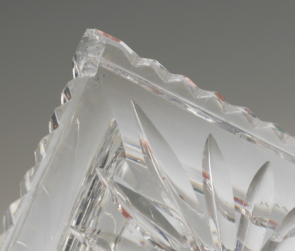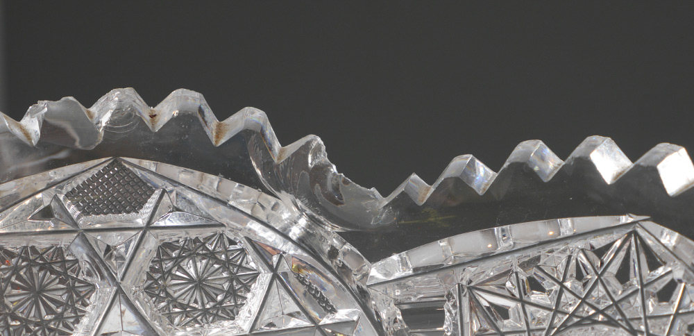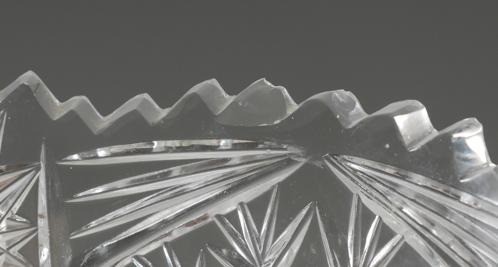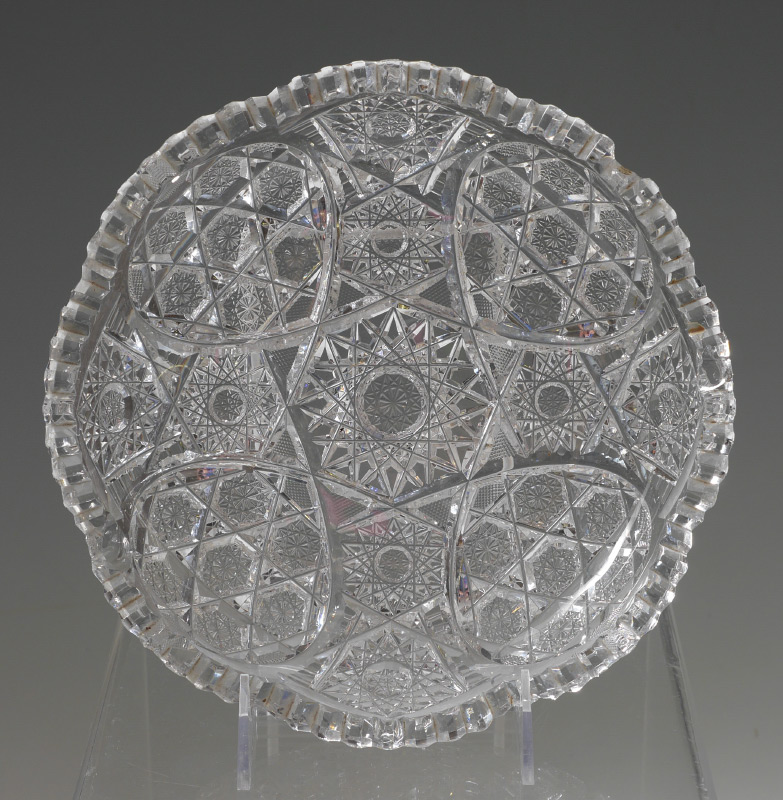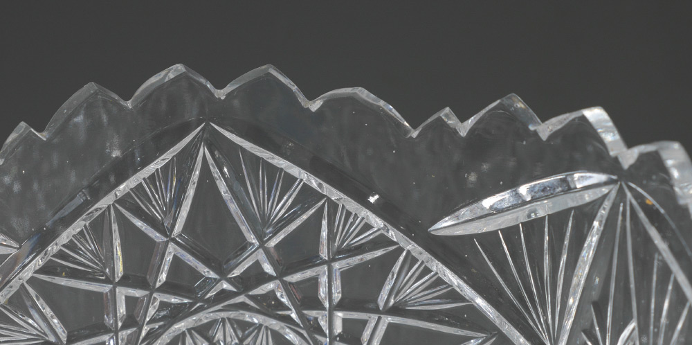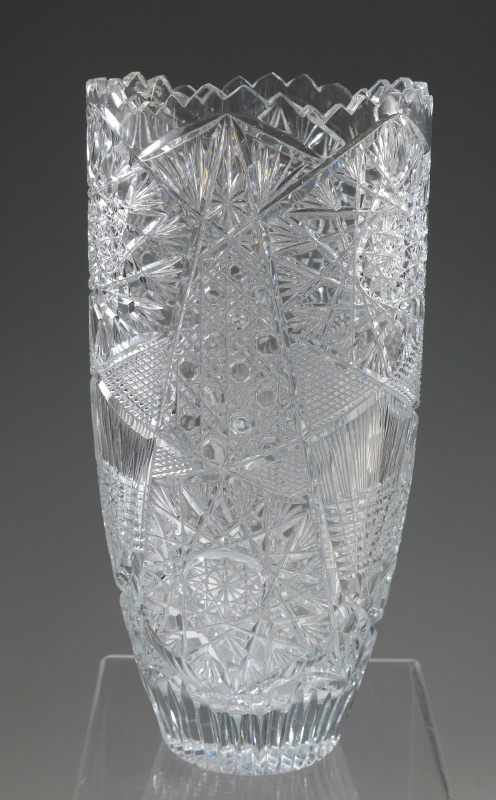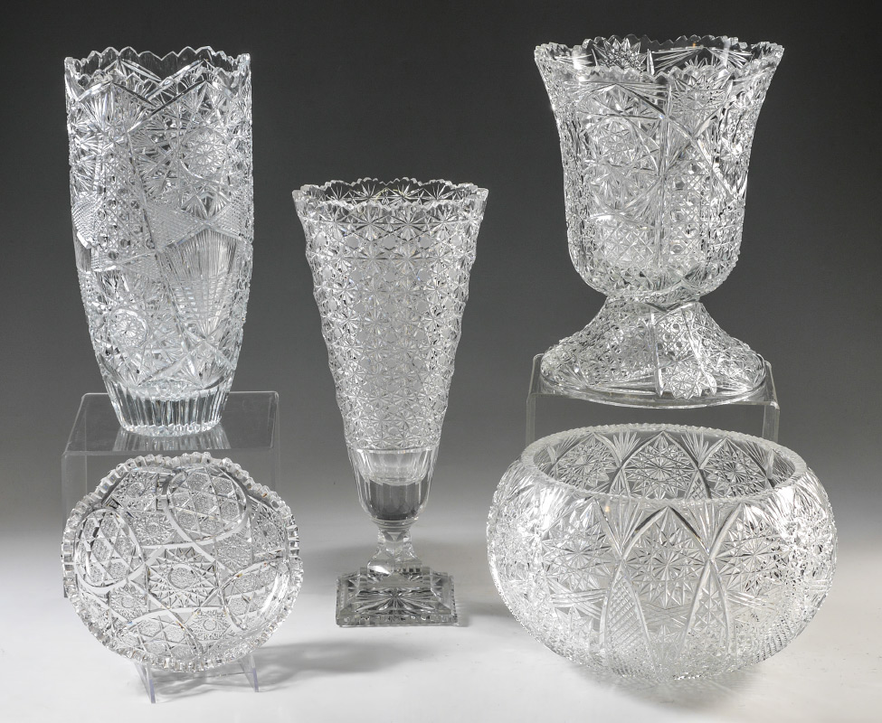 5 CUT GLASS BOWLS AND VASES: An assembled collection of 5 pieces total to include 1) Punchbowl, 7 1/2'' h. x 12''. 2) Low bowl 2'' x 9'' dia. 3) Tall tapered vase, 15'' h. x 7 1/4''. 4) Footed vase, 16 1/2'' h. x 7 1/2'' x 6''. 5) Large footed bowl, 13 1/4'' h. x 10'' dia.