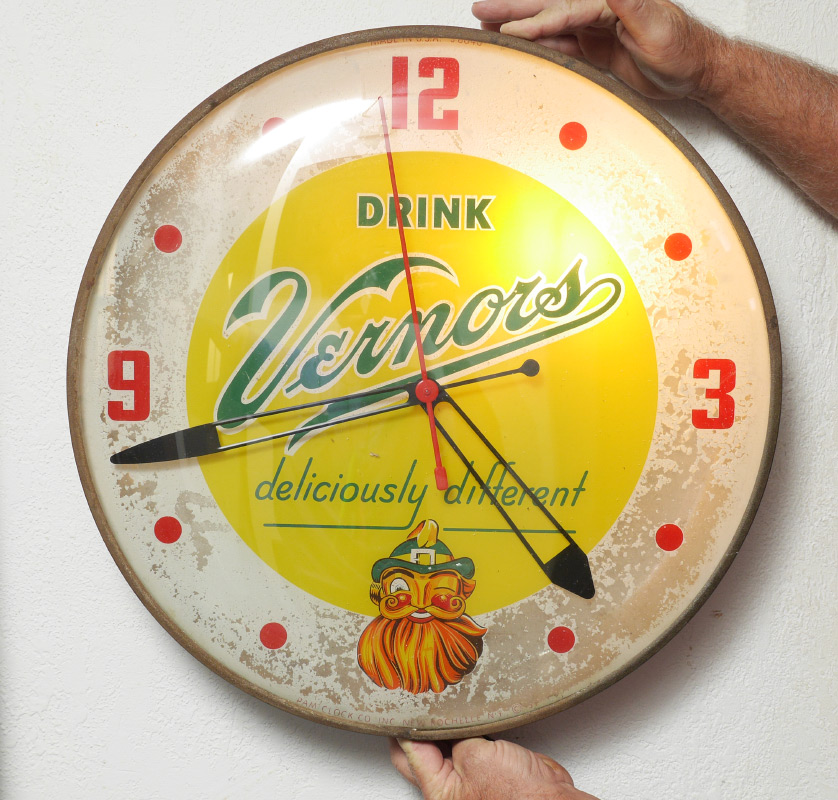 VERNORS LIGHT UP ADVERTISING WALL CLOCK: Back lit glass dial with ''Drink Vernors, Deliciously Different'' motto, metal case, electric movement, 20 1/4'' dia. x 3 1/2'' deep.