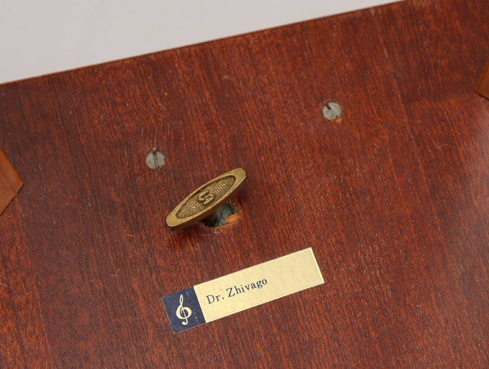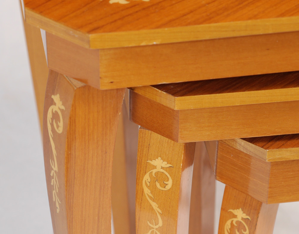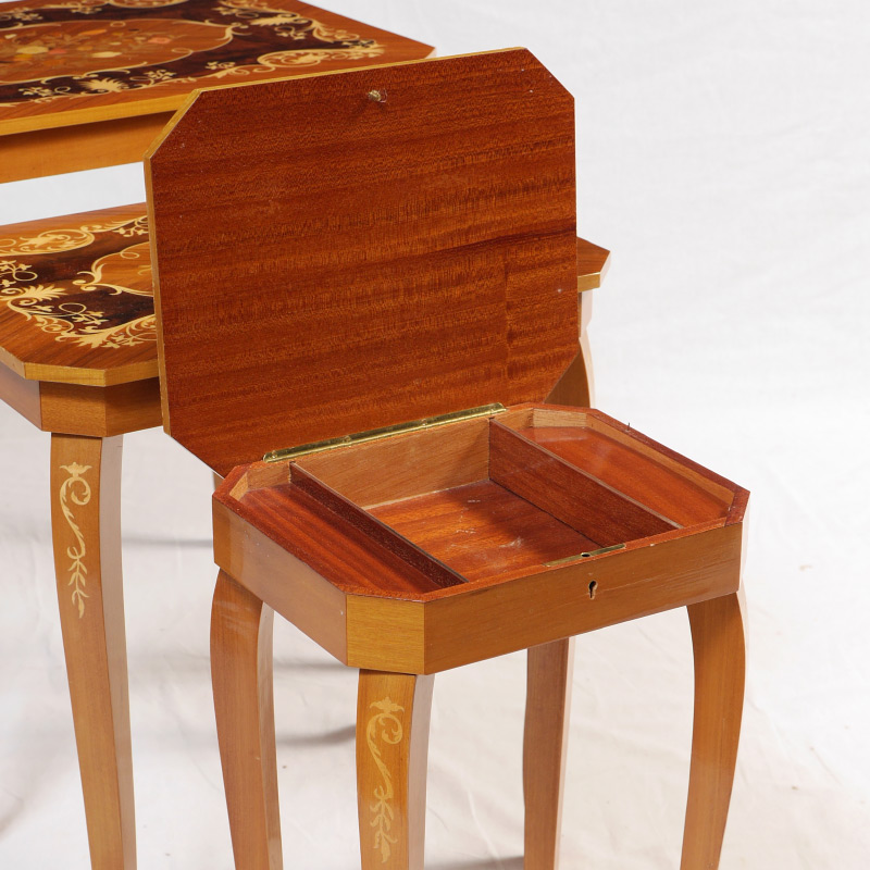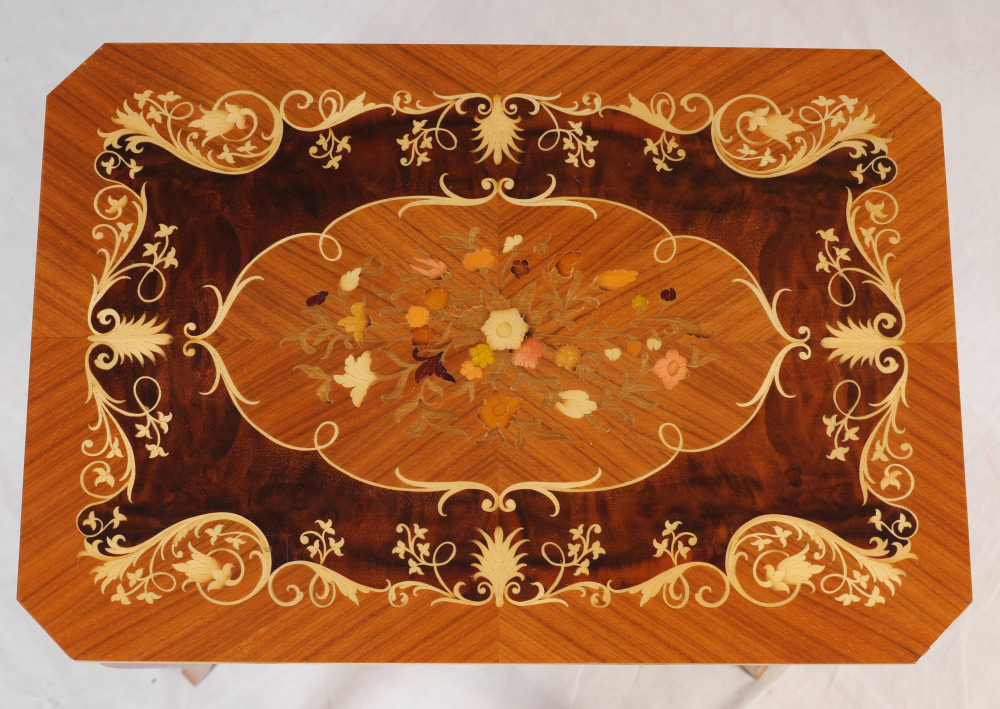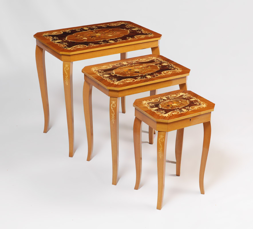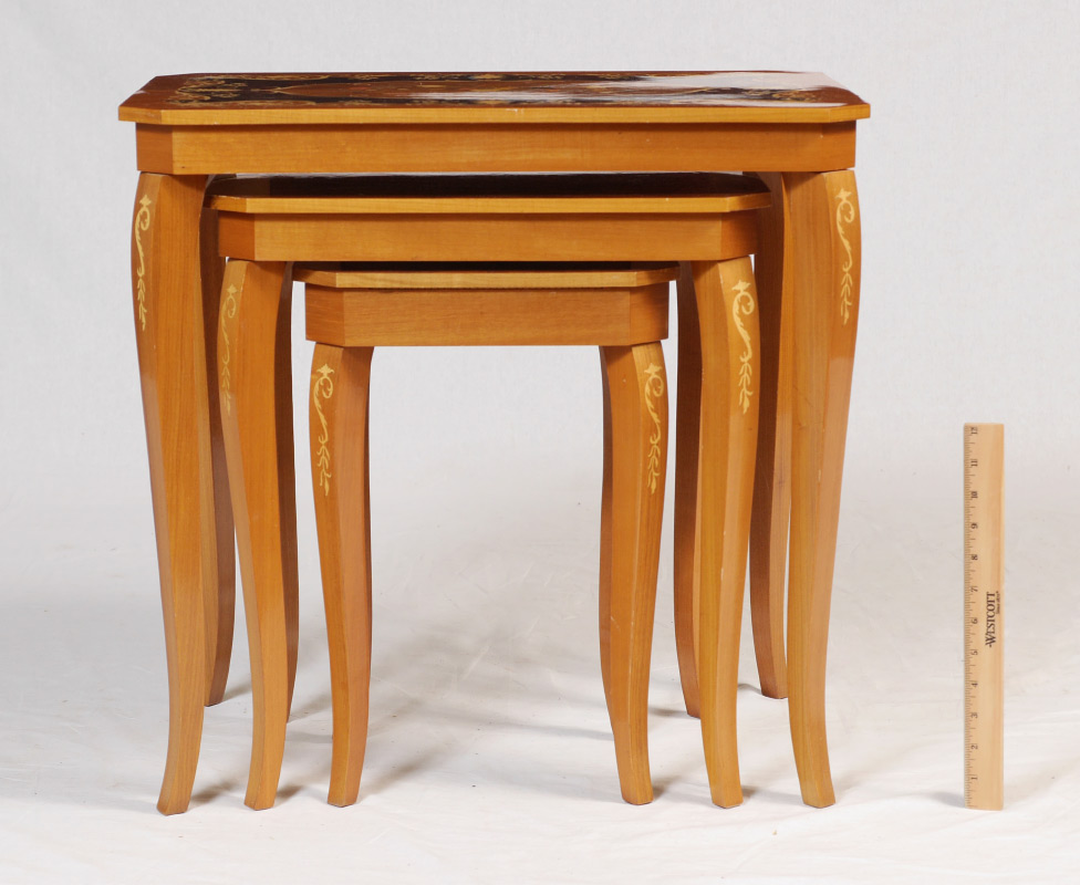 3 INLAID ITALIAN NESTING TABLES: All with mixed wood floral motif bouquet inlay, smallest stand with hinged lid and music box that plays Lara's Theme from Dr. Zhivago. Tallest measures 22 1/4'' h. x 22 1/2'' x 15 1/2''.
