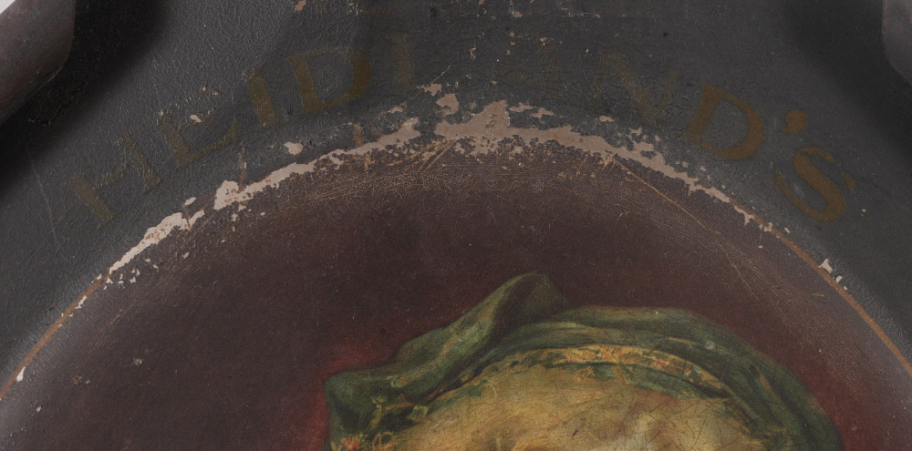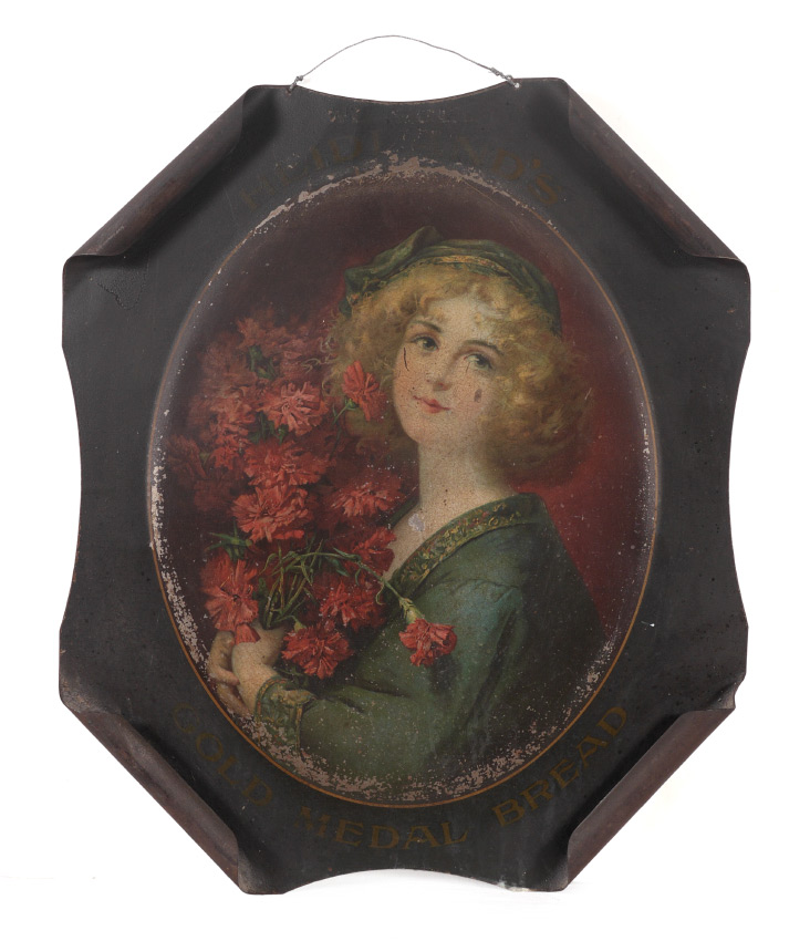 HEIDLAND'S GOLD MEDAL BREAD TIN LITHO ADVERTISEMENT: Tin panel with upturned corners, center image of maiden with flowers advertising Heidland's Gold Medal Bread. Overall 18'' x 15 1/2'' x 1/2''.