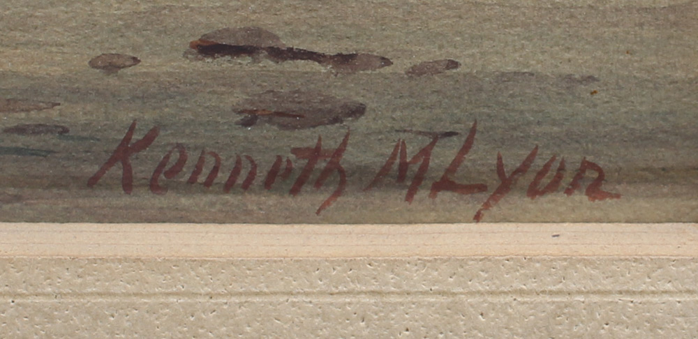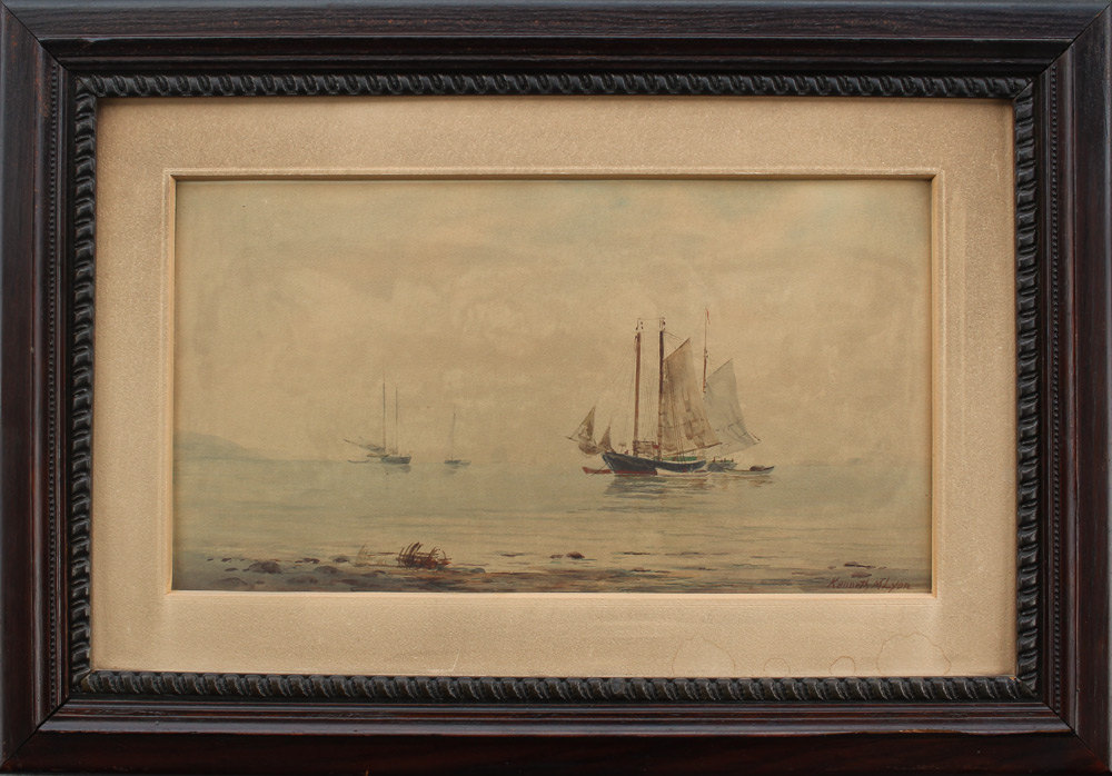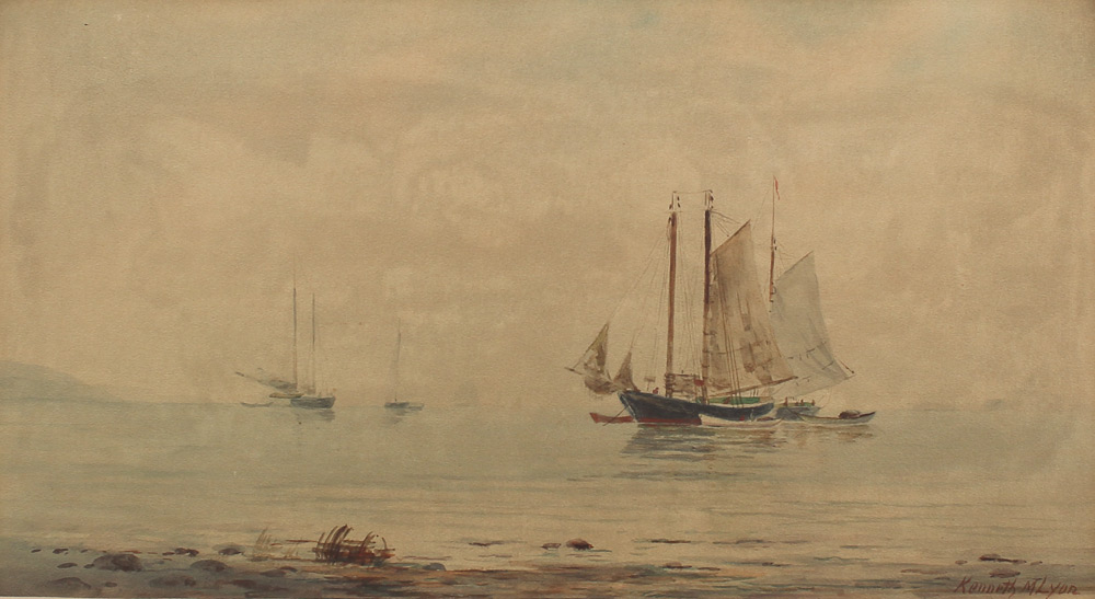 FINE KENNETH M. LYON WATERCOLOR PAINTING: Boats at Anchor in the Harbor, Watercolor, signed lower right, sight size 10.75'' x 19.5'', framed 20'' x 29''.