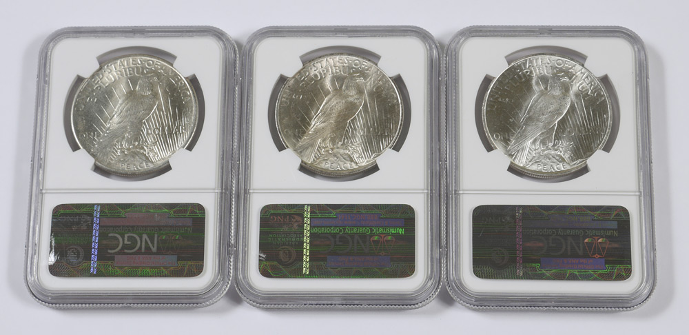 3 MS66 PEACE DOLLARS NGC: Slabbed and graded MS66 by NGC, to include 2 1922 and a 1925