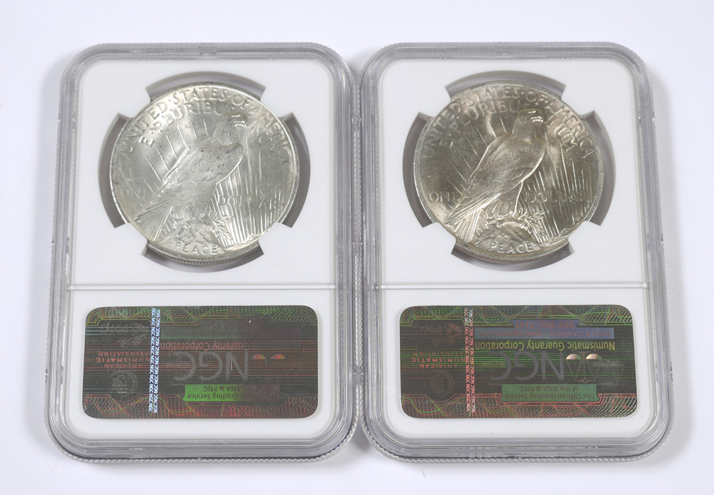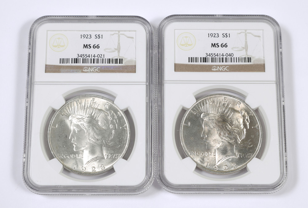 2 1923 MS66 PEACE DOLLARS NGC: Slabbed and graded MS66 by NGC.