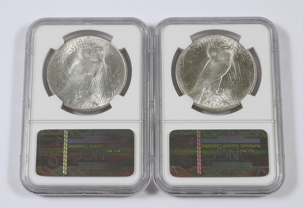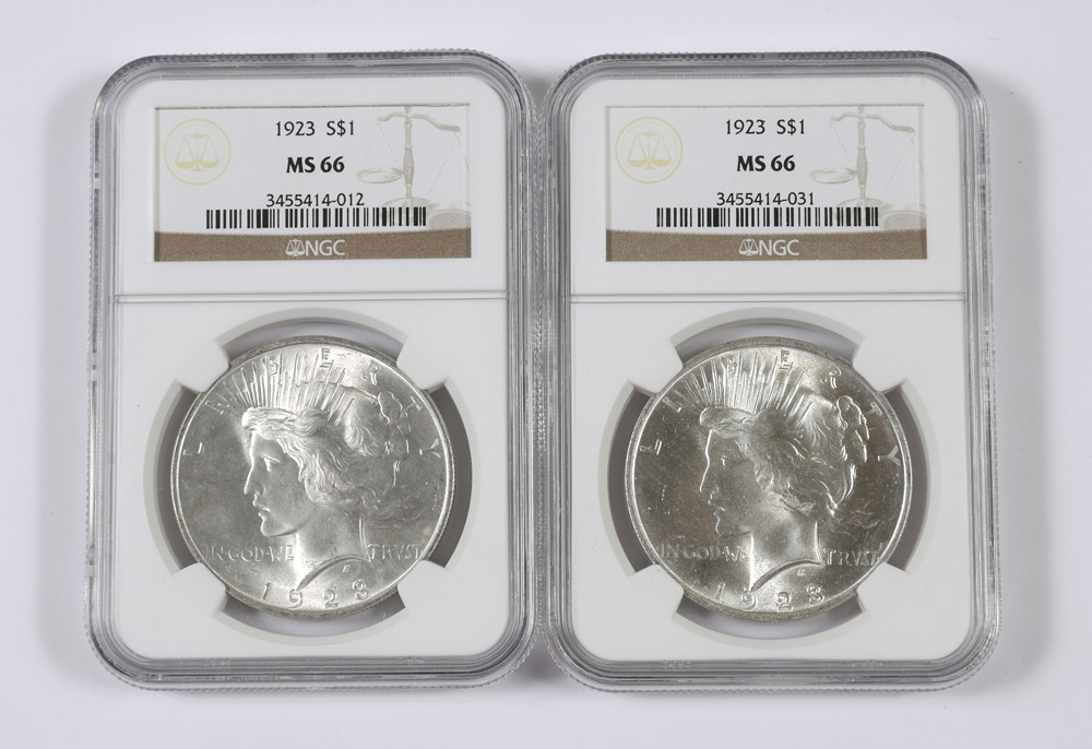 2 1923 MS66 PEACE DOLLARS NGC: Slabbed and graded MS66 by NGC.