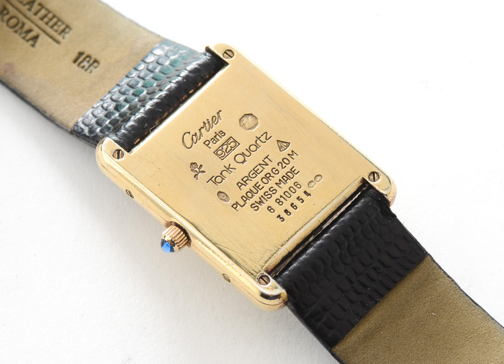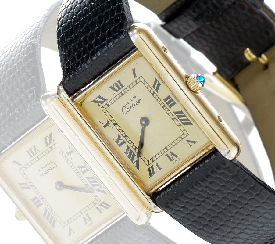 CARTIER MUST DE TANK UNISEX WATCH: Swiss made quartz movement. 20 micron 18kt yellow gold electroplated over .925 sterling silver case. Champagne color dial with classic Cartier Roman black printing.