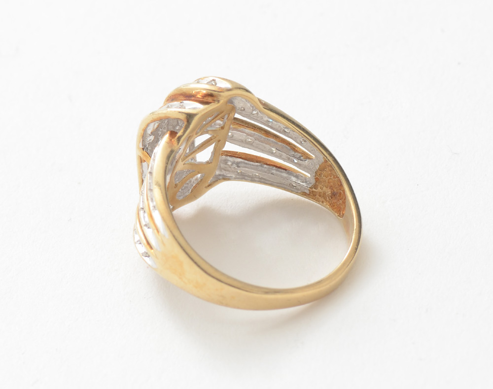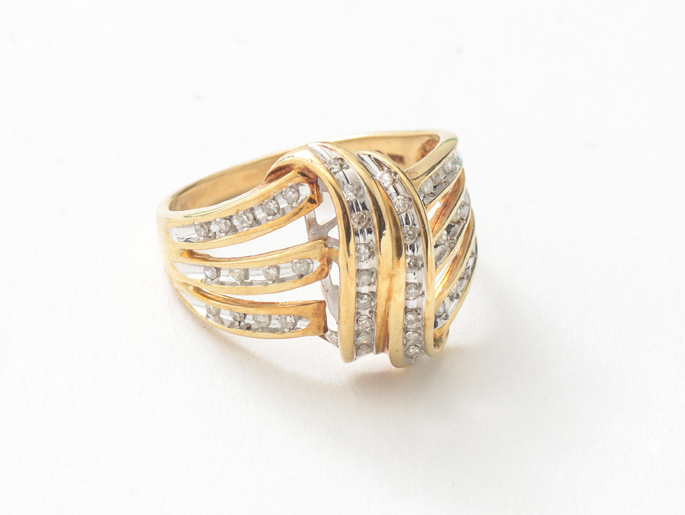 DIAMOND AND GOLD RIBBON COCKTAIL RING: 44 Round Single Cut Diamonds are set in 10K Yellow Gold Ribbon Ring. Diamonds are rate SI in clarity, H-I in color and weigh .50 Ct approx. Size 7.5, total weight 4.0 grams.