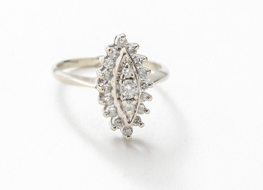 WHITE GOLD DIAMOND COCKTAIL RING .50 CTW: 14K White Gold Ring Contains 19 Round Full Cut and Single Cut Diamonds Rated SI in Clarity and H-I in Color. .50CTW, Size 7 and Weight 4.0 grams.