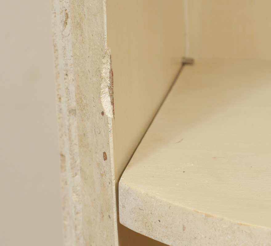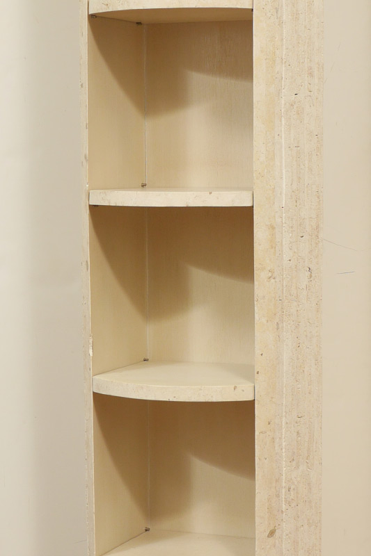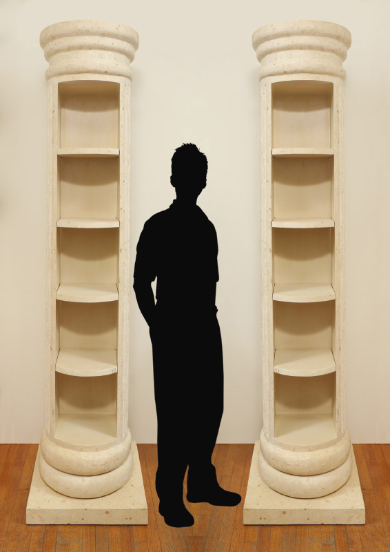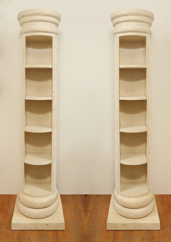 PAIR OF FAUX MARBLE DISPLAY COLUMNS: Composite material fluted columns with 4 open display shelves, square base, rotate to conceal shelves. Overall measures 86 1/2'' h. x 22 1/4'' x 22 1/4''.