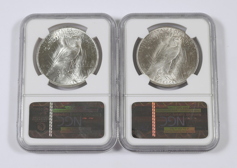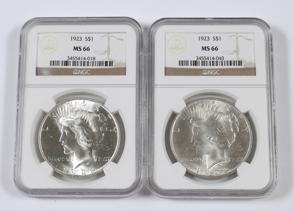 2 1923 MS66 PEACE DOLLARS NGC: Slabbed and graded MS66 by NGC.
