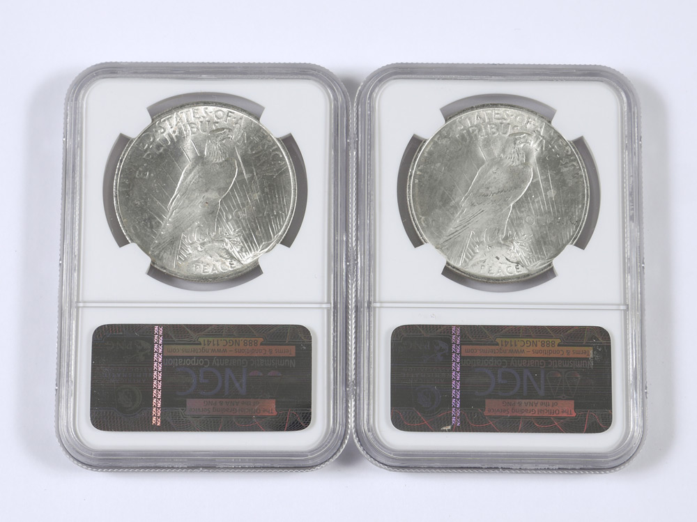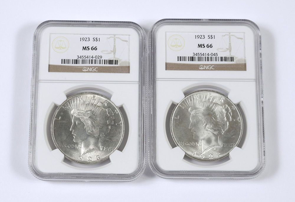 2 1923 MS66 PEACE DOLLARS NGC: Slabbed and graded MS66 by NGC.