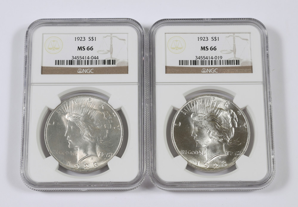 2 1923 MS66 PEACE DOLLARS NGC: Slabbed and graded MS66 by NGC.