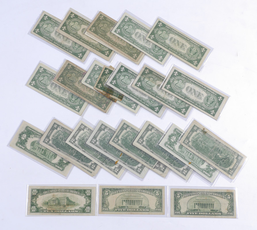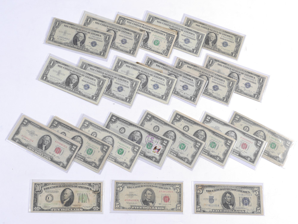 A NICE COLLECTION OF US CURRENCY: Approx. $131 in total face value to include 1934A $10, 1934D $5, 1963 $5, 1953 & 1953A $2, thirty-six 1976 or after $2, thirty-five $1 silver certificates. Ungraded.