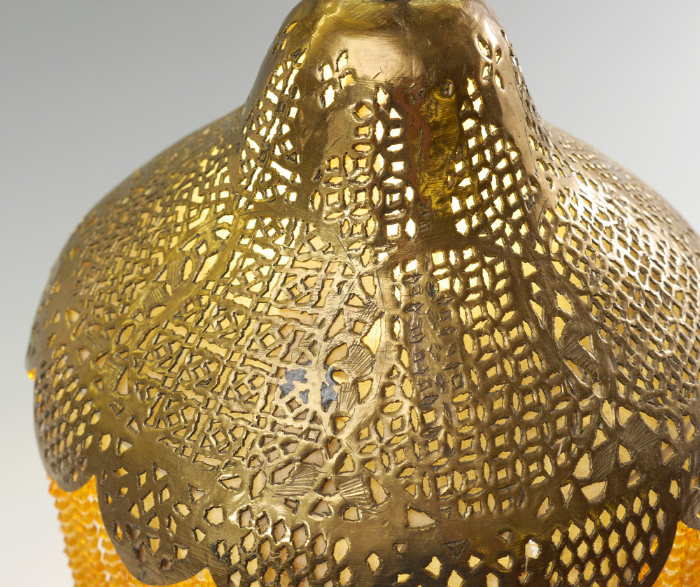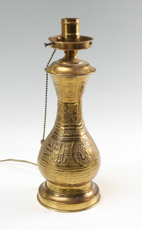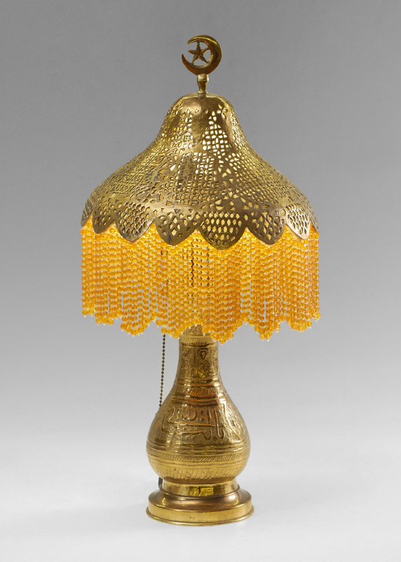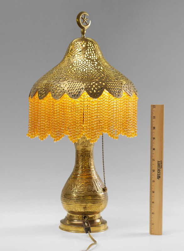 MIDDLE EASTERN EMBOSSED BRASS TABLE LAMP: Smaller boudoir lamp, embossed brass base with Arabic writing and camel in medallion. Cloth lined pierced brass shade with plastic bead drops, crescent moon and star finial. Overall measures 21'' h. x 9 1/2'' shade dia.