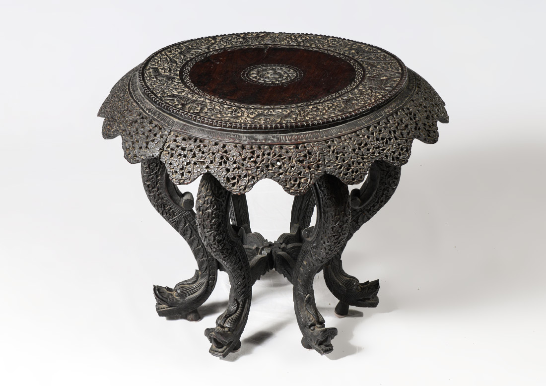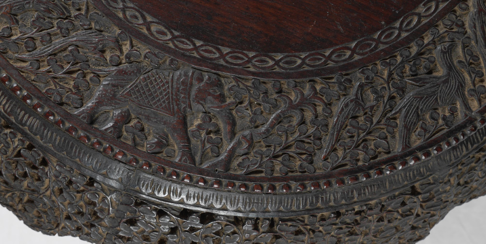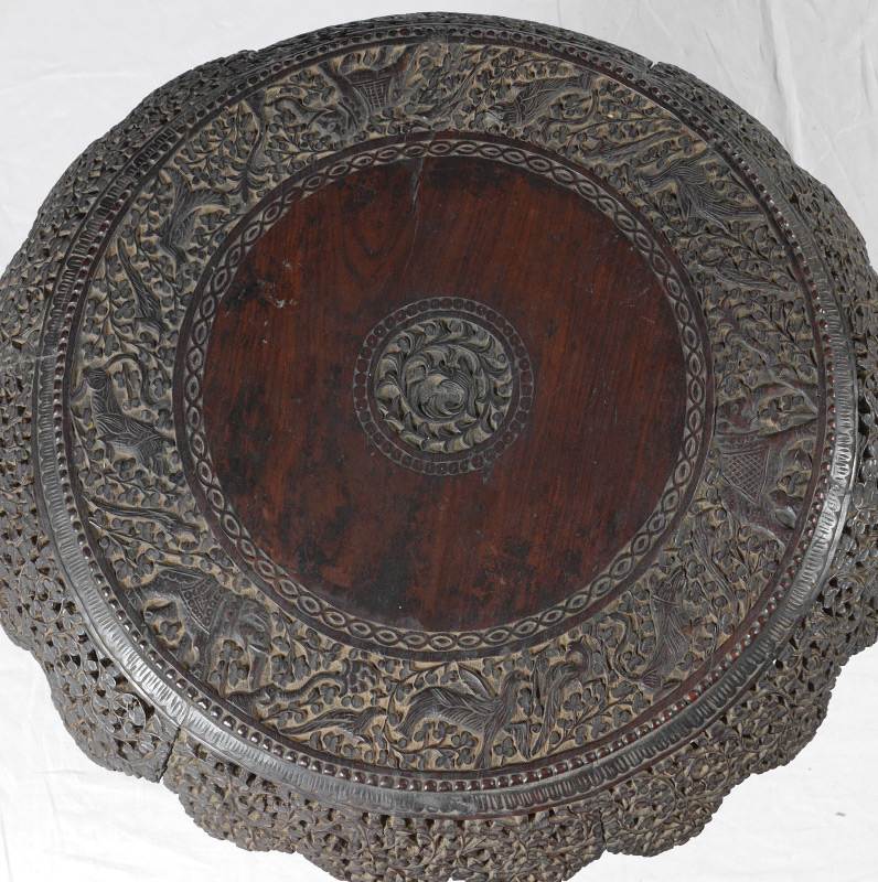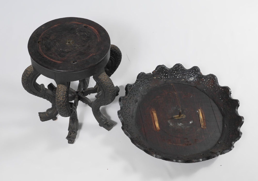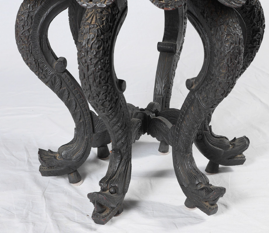 CARVED BURMESE CENTER TABLE: Round tope with intricately carved trim and shaped skirt, base with 6 carved figural serpent legs, overall 22'' h. x 26''.