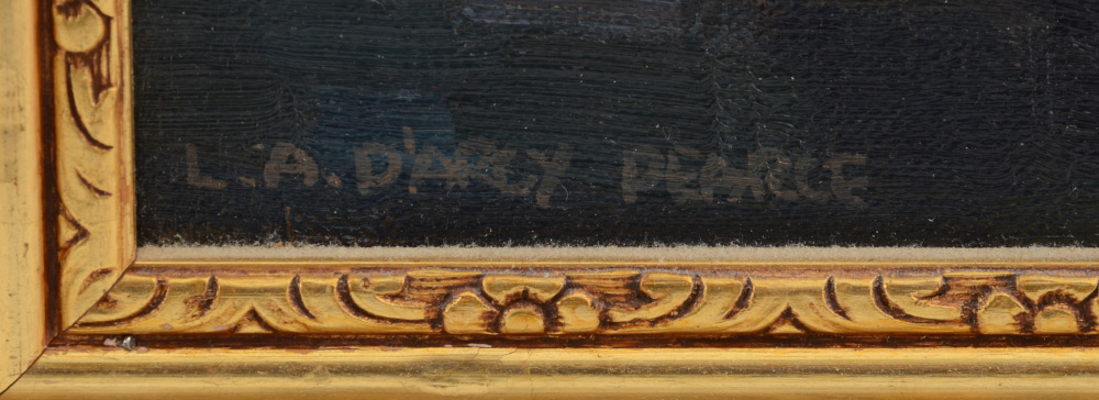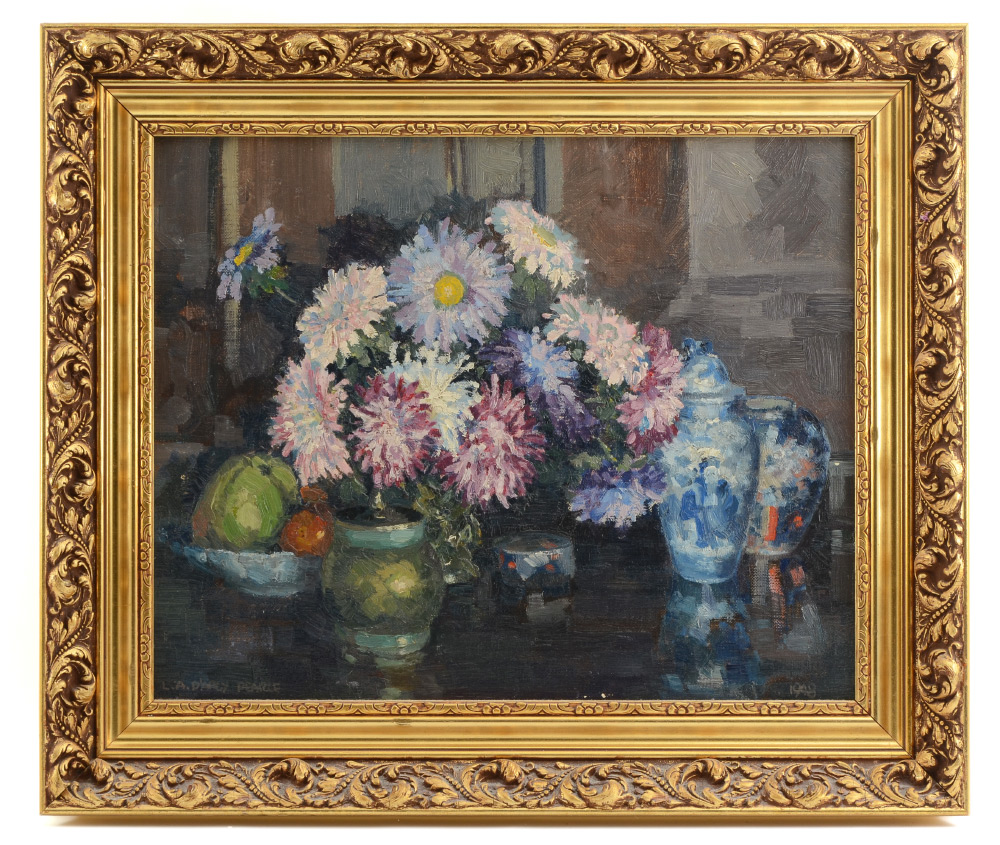 L.A. D'ARCY PEARCE STILL LIFE PAINTING: Scene Depicts Fruit, Oriental Pottery Vases and Chrysanthemums, Oil/Canvas, 16'' x 20'', signed lower left, dated lower right 1948, framed, 21.75'' x 25.75''.