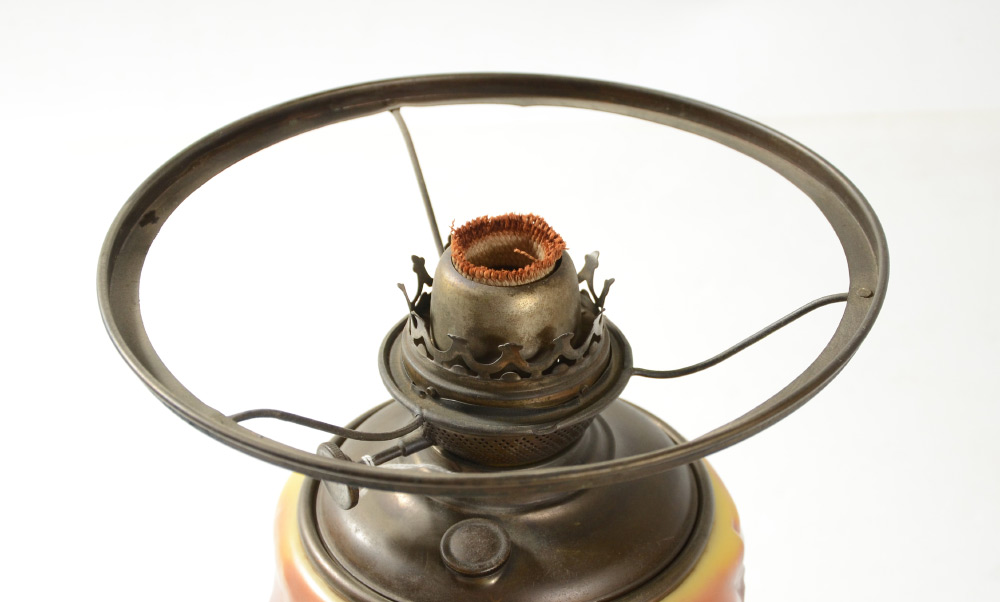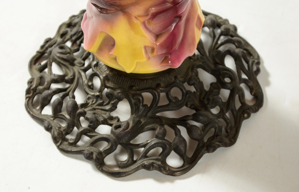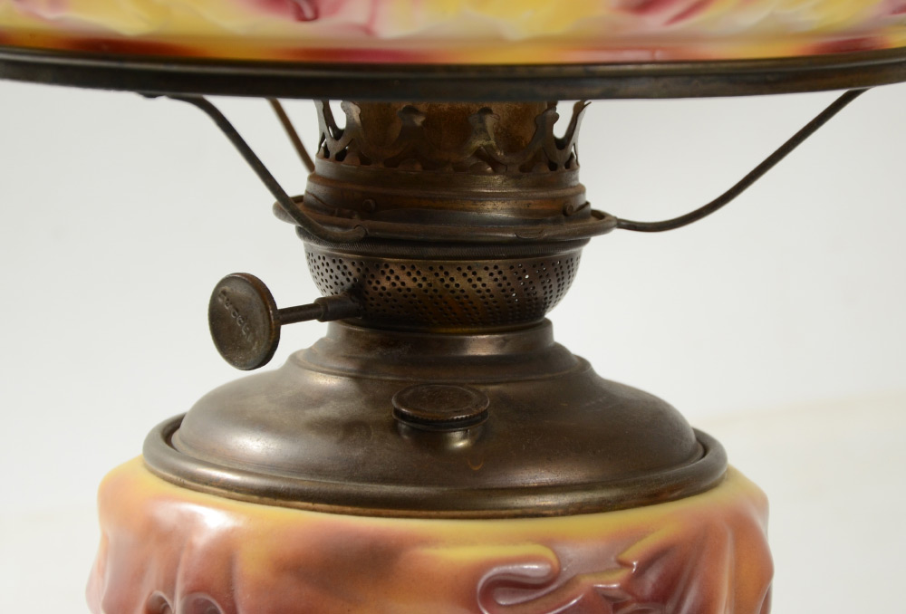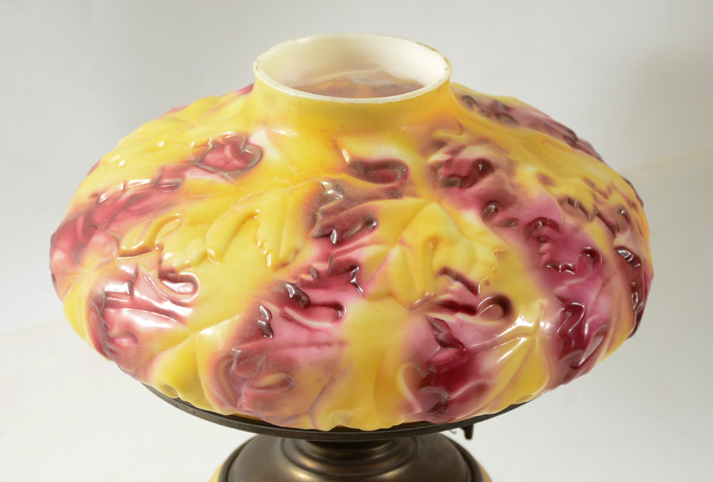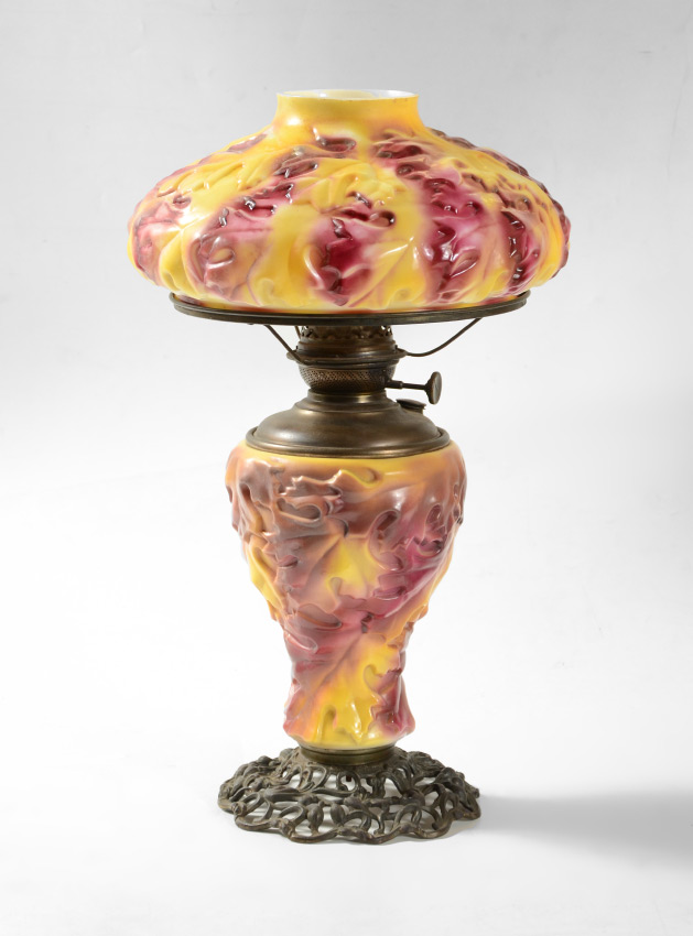 UNIQUE OAK LEAF GLASS OIL LAMP: In the style of Consolidated or Phoenix glass, body and shade with autumnal shade oak leaf motif. Foliate motif open work cast metal base. Original oil Success oil font. Base measures 15 1/2'' h. x 10 1/2''. Shade 6'' h. x 12 1/2'', 10'' fitter rim.