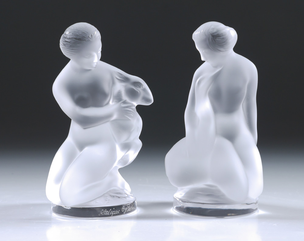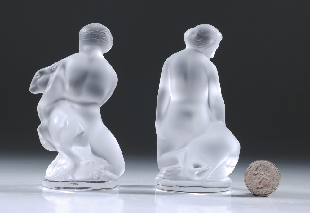 2 LALIQUE CRYSTAL NUDE PAPERWEIGHTS: 2 pieces total to include 1) Kneeling nude with a goat, 4 1/2'' h., original box. 2) Kneeling nude with swan, 4 3/4'' h., original box, 2 3/4'' h. x 7'' x 4''.