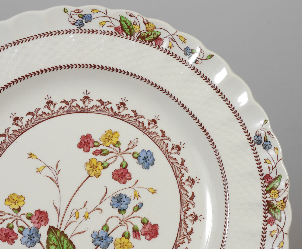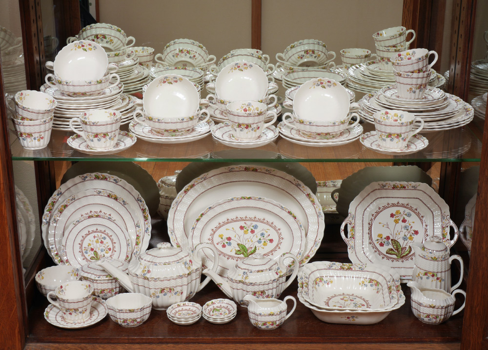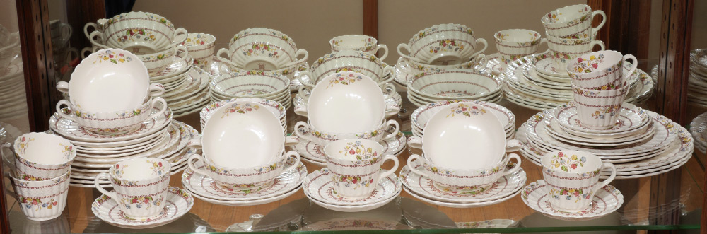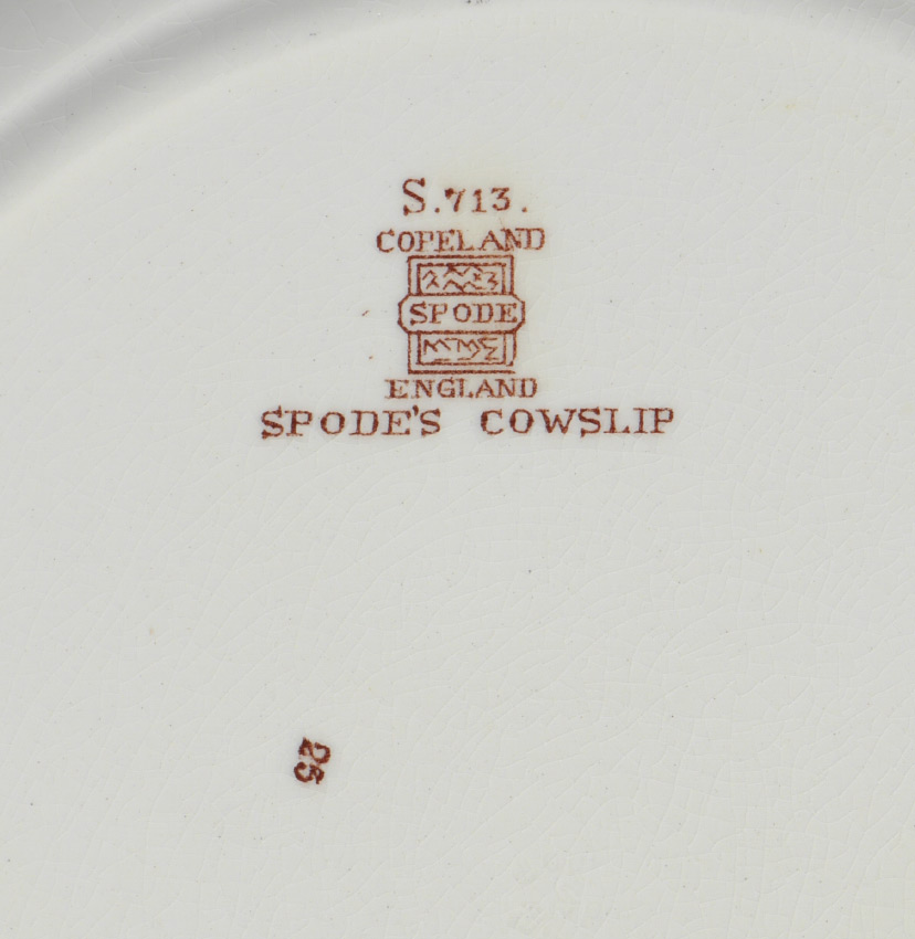 SPODE COWSLIP CHINA SERVICE: Approx. 77 pieces in the Cowslip pattern by Spode to include 6 dinner plates (10 1/2''), 6 salad plates (9''), luncheon plate, 6 bread plates (6 3/4''), 4 cereal bowls, 7 dessert bowls, 6 cream soup bowls, 8 underplates, 8 teacups and 7 saucers, 2 platters (largest 15''), 2 open vegetables, 2 creamers, 2 sugars, 2 teapots, 6 butter pats, square cake plate (9 3/4''), cranberry bowl (4 1/4'').