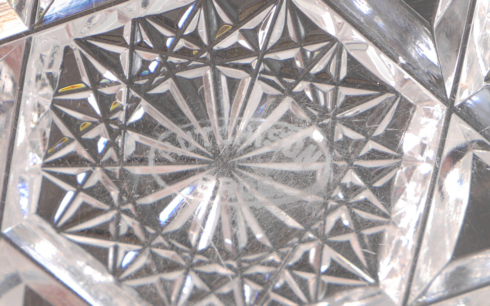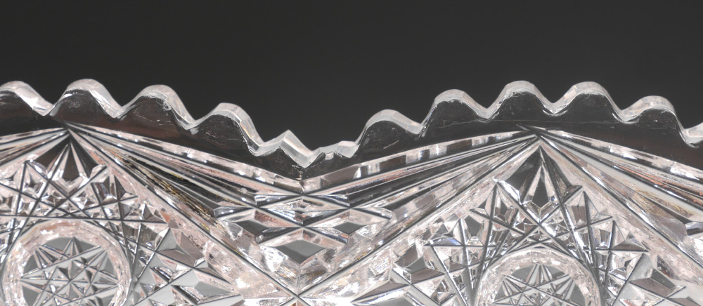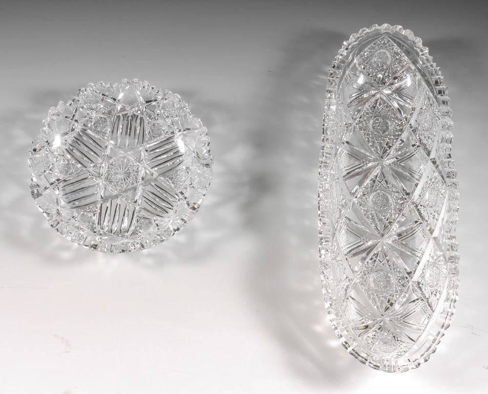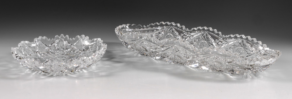 2 SIGNED CUT GLASS BOWLS: 2 pieces total to include 1) J. Hoare signed oval relish or condiment dish, 2'' h. x 12'' x 4 1/2''. 2) Hutchison Bros. signed low bowl, 1 1/4'' h. x 6 1/2''.
